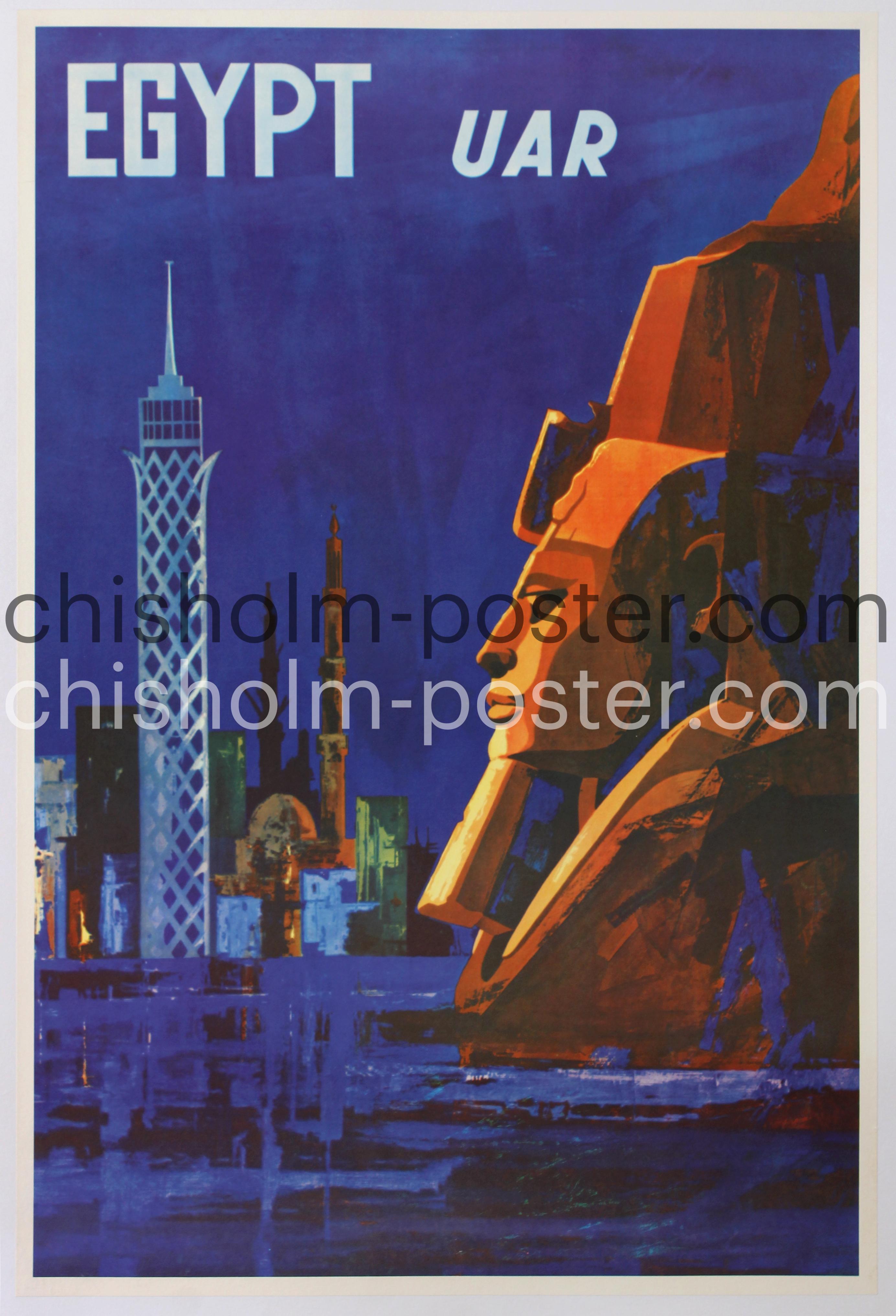 The illustration includes the Cairo Tower. It was designed by the Egyptian architect Naoum Shebib, inspired by the ancient egyptian architecture... intended to evoke a pharaonic lotus plant, an iconic symbol of Ancient Egypt. The tower's construction was completed in 1961 (Wikipedia). NOTE: This travel poster already has archival linen backing