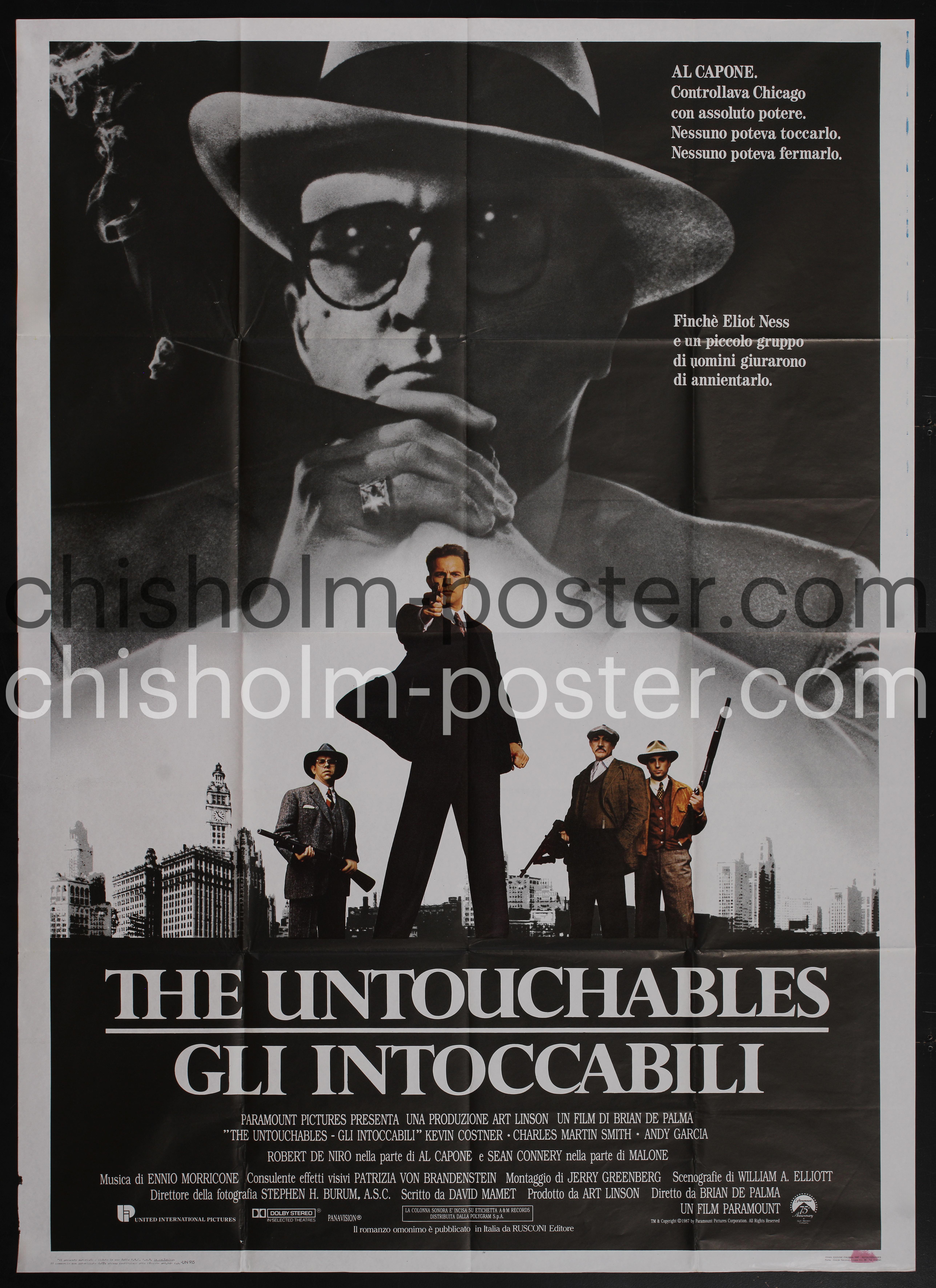 Italian release 4 foglio poster for The Untouchables, a 1987 American crime film directed by Brian De Palma, produced by Art Linson, and written by David Mamet. It stars Kevin Costner, Charles Martin Smith, Andy García, Robert De Niro, and Sean Connery. Set in Chicago in 1930, the film follows Eliot Ness (Costner) as he forms the Untouchables team to bring Al Capone (De Niro) to justice during Prohibition. Music by Ennio Morricone. (Wikipedia)