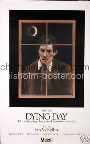 1982, PBS/Mobil Mystery! presentation of Dying Day, starring Ian McKellen. The caption reads: "He knows he's going to be murdered - he even knows the date." Hosted by Vincent Price.