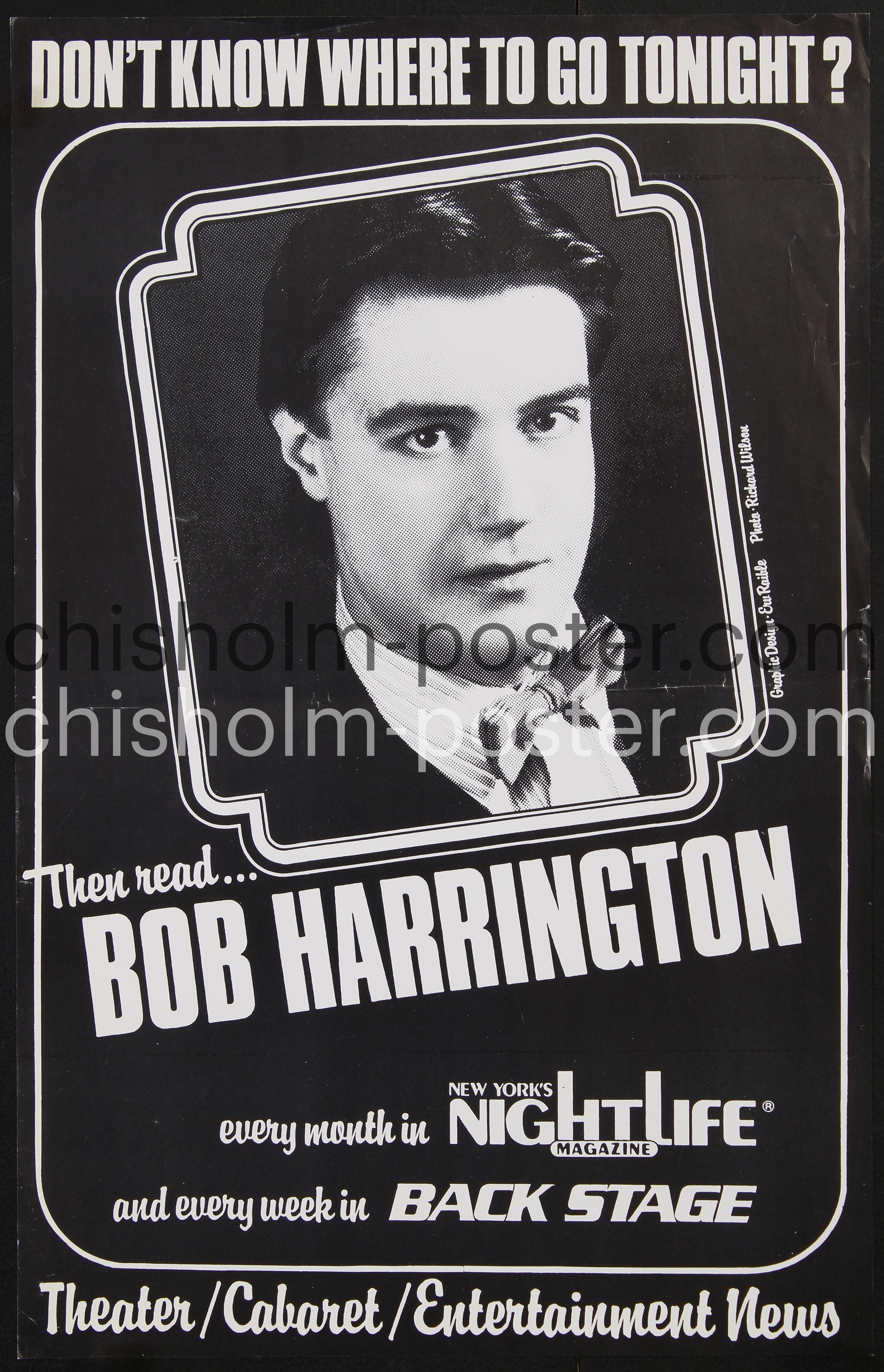 1980s poster for the cabaret critic Bob Harrington who wrote for The New York Post, Nightlife Magazine, and the trade paper Back Stage. Great graphics from a series by Erv Raible.