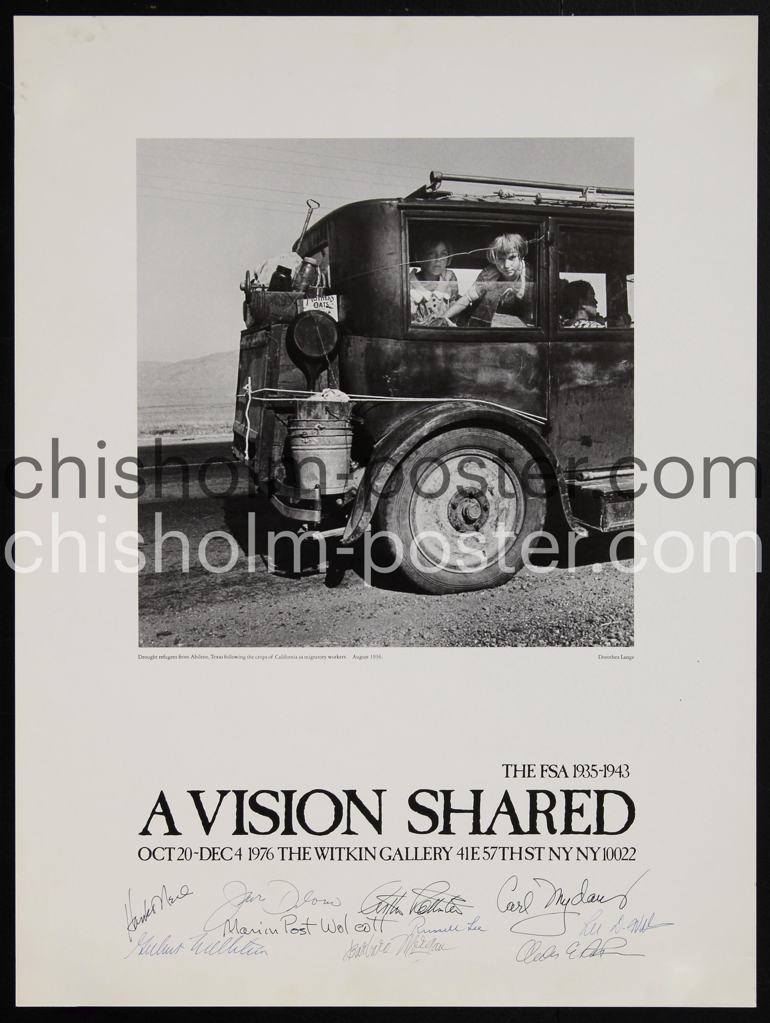 1976 NYC Photography Farm Security Administration (FSA) exhibition and Hank O’Neal book launch poster acquired from the Naomi Rosenblum Collection. Featuring the work: "Drought Refugees from Abilene, Texas Following the Crops of California as Migratory Workers." August 1936 by Dorthea Lange. SIGNATURES in ink include TOP ROW: Hank O’Neal, Jack Delano?, Arthur Rothstein, Carl Mydans; MIDDLE ROW: Marion Post Wolcott, Russell Lee, Illegible (Lee D?); BOTTOM ROW: Illegible, Barbara Morgan, Illegible.
