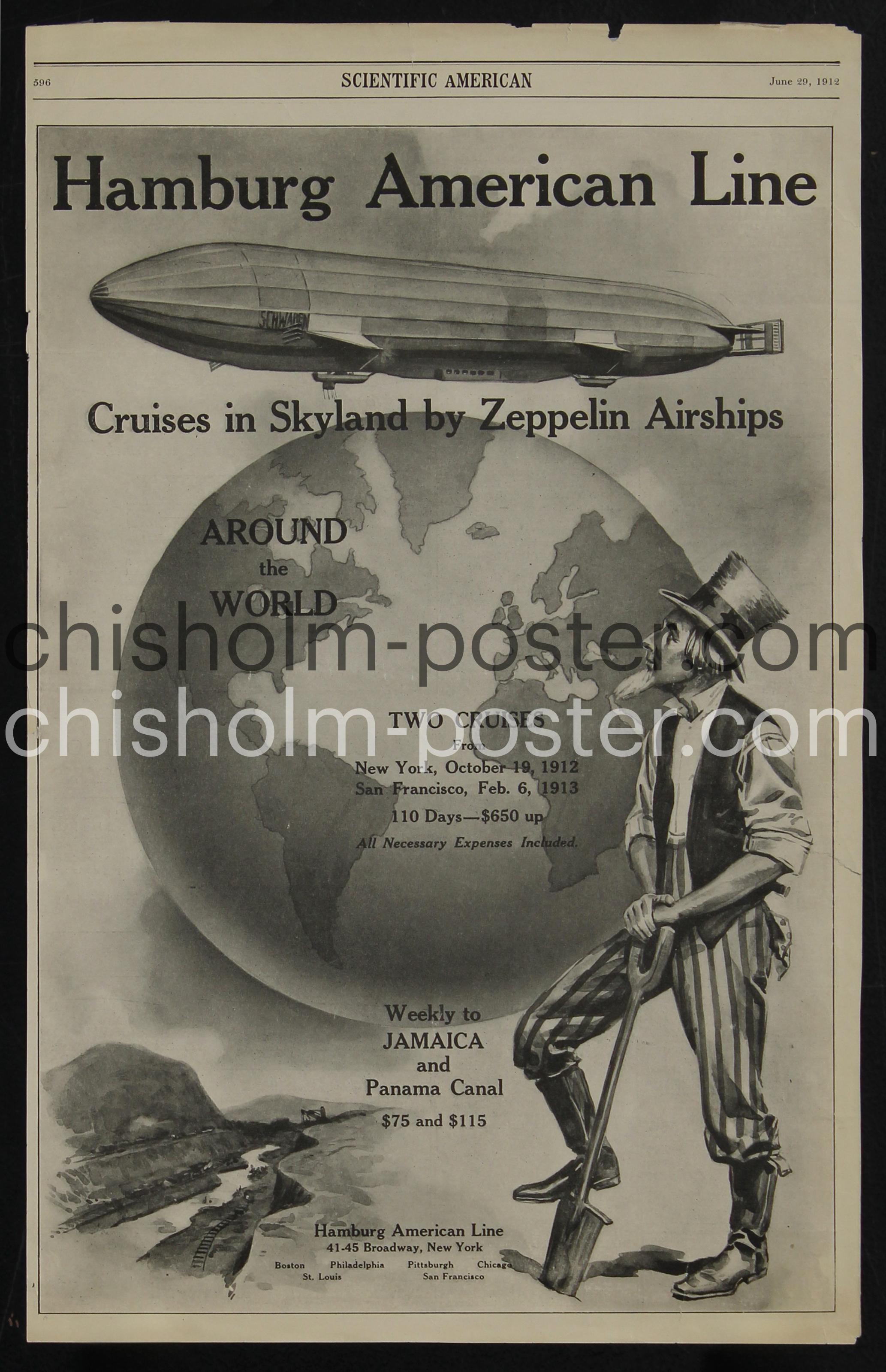 We have here a fascinating bit of ephemera: an original vintage page from Scientific American June 29, 1912 advertising the Hamburg American Line Cruises in Skyland by Zeppelin Airships. In 1912, the Hamburg America Line (HAPAG) was involved with airship travel, primarily through its association with the Deutsche Luftschiffahrts-Aktiengesellschaft (DELAG), the world's first airline. Uncle Sam with a shovel references the ongoing construction of the Panama Canal (later opened for commercial traffic on August 15, 1914) with a view of the canal in the vignette below. The listing reads: "Around the World Two Cruises From: -New York, October 19, 1912 -San Francisco, Feb. 6, 1913 -110 Days—$650 up -All Necessary Expenses Included -Weekly to Jamaica and Panama Canal $75 and $115"
