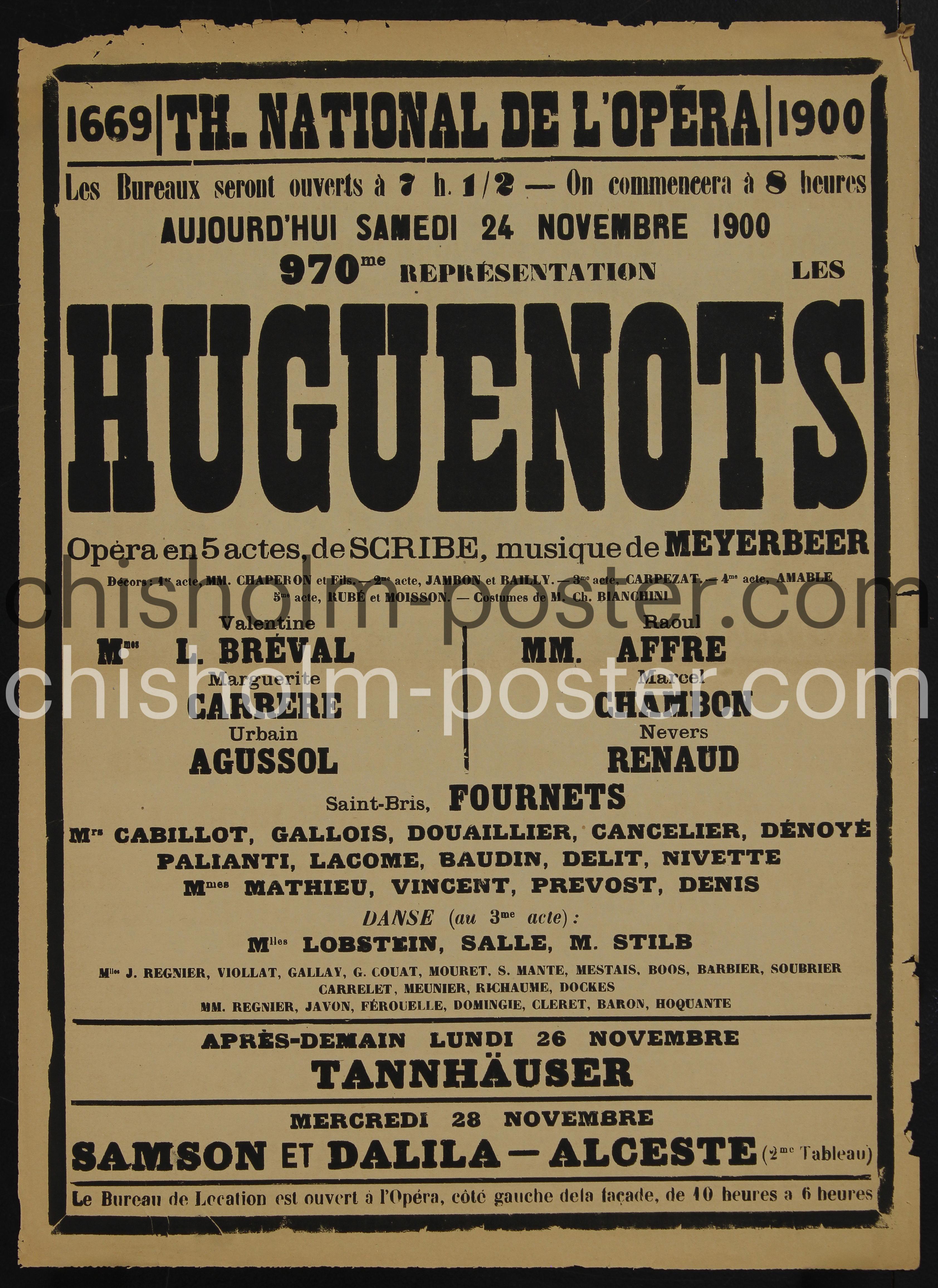 1900 Large original letterpress program poster for the Theatre National de l'Opera (now called Opera National de Paris / Paris Opera) for a performance that took took place on Saturday, November 24, 1900. A grand opera in five acts, with music by Giacomo Meyerbeer and a French libretto by Eugène Scribe and Émile Deschamps.