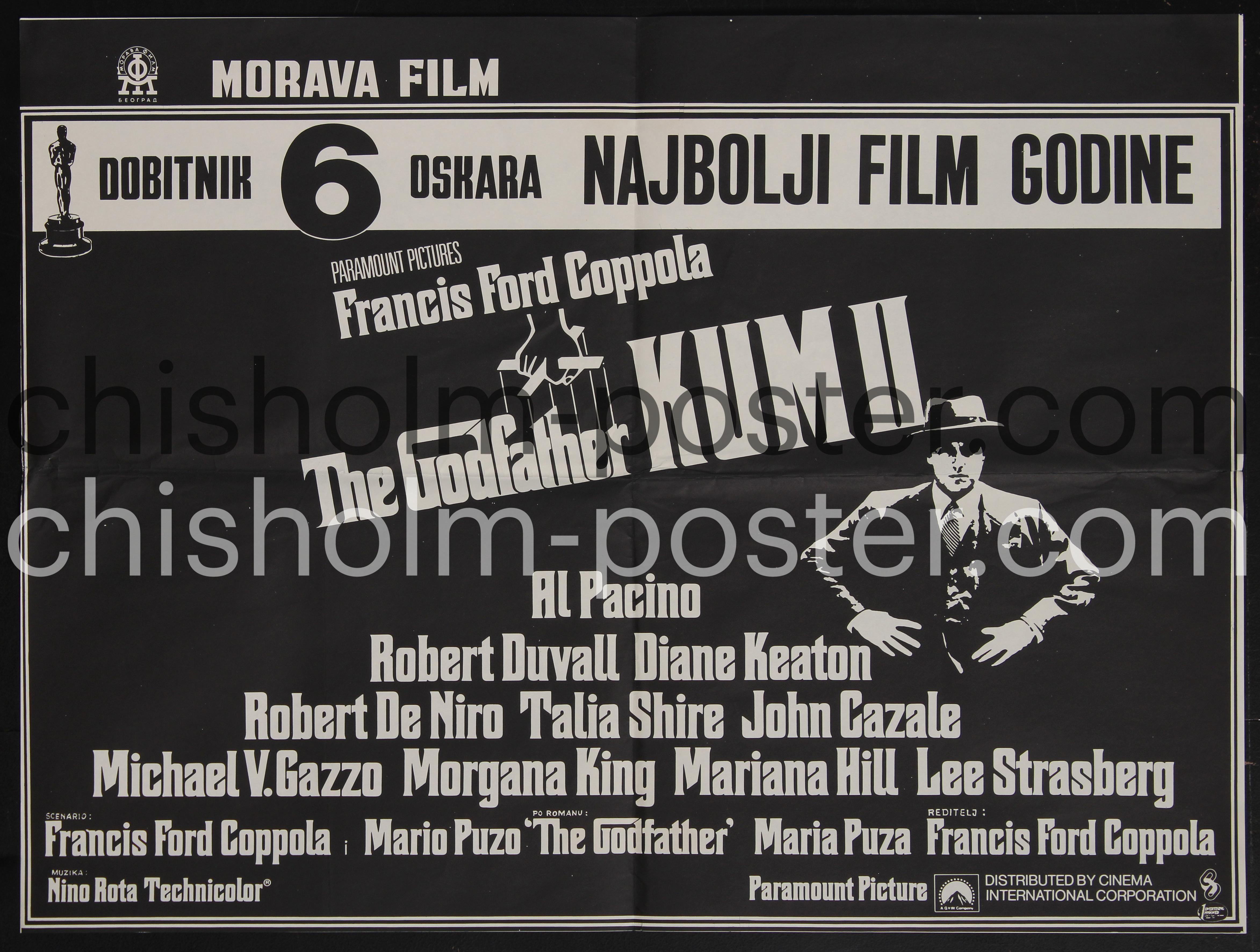 Yugoslavian release poster from Morava Film. "The Godfather Part II is a 1974 American epic gangster film produced and directed by Francis Ford Coppola, loosely based on the 1969 novel The Godfather by Mario Puzo, who co-wrote the screenplay with Coppola. It is both a sequel and a prequel to the 1972 film The Godfather, presenting parallel dramas: one picks up the 1958 story of Michael Corleone (Al Pacino), the new Don of the Corleone family, protecting the family business in the aftermath of an attempt on his life; the other covers the journey of his father, Vito Corleone (Robert De Niro), from his Sicilian childhood to the founding of his family enterprise in New York City. The ensemble cast also features Robert Duvall, Diane Keaton, Talia Shire, Morgana King, John Cazale, Marianna Hill and Lee Strasberg." (Wikipedia)