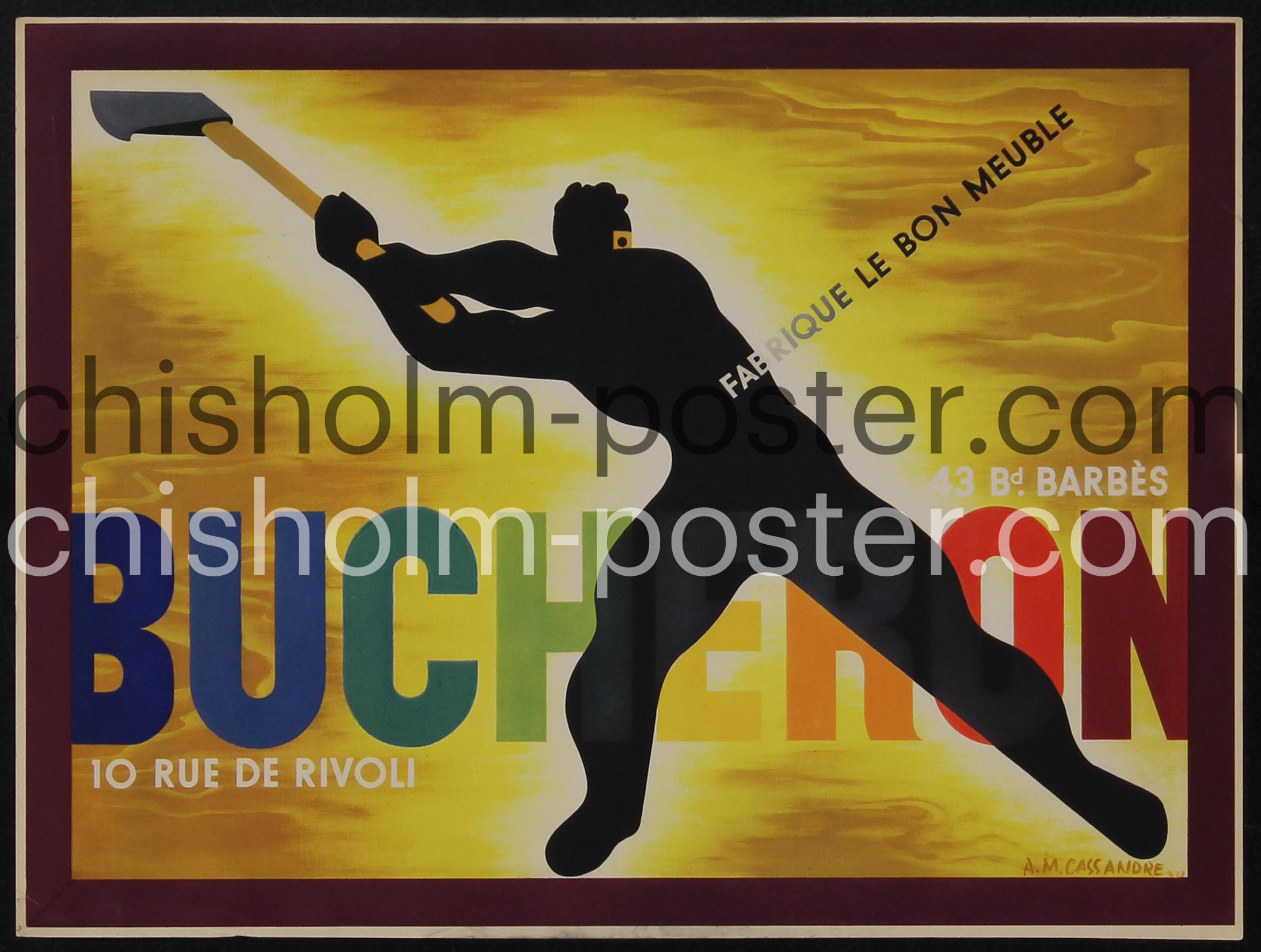This is a small original lithographic version of one of A. M. Cassandre designs for Bucheron furniture makers / woodworkers. It was printed in 1936 as a page in the portfolio "Le Spectacle Est Dans La Rue," which was a promotional book created by Draeger Frères printing house to showcase their collaborative work with A.M. Cassandre. Tagline: "Fabrique le bon meuble" (Make good furniture)