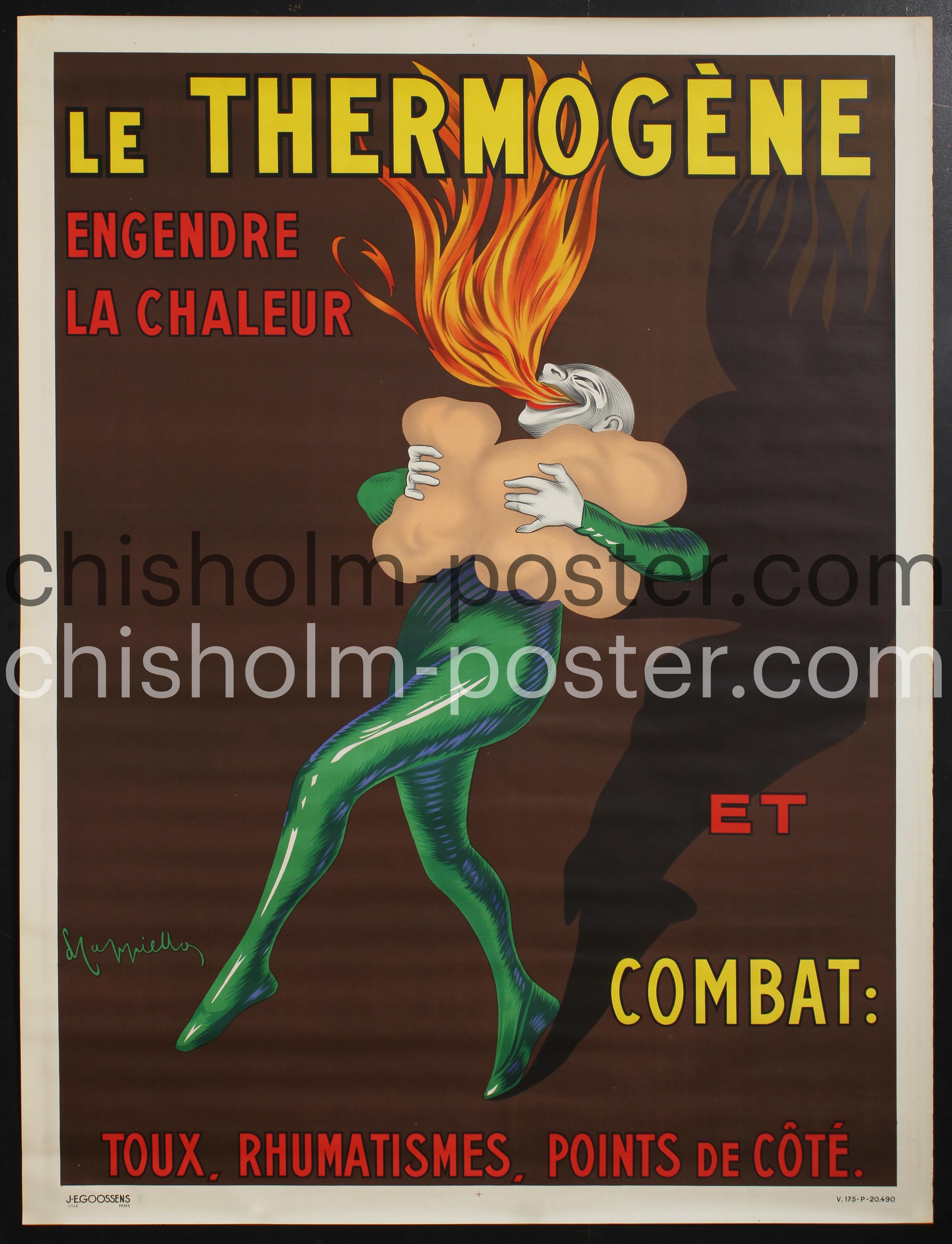 This is a later 1930s/1940s printing. Designed by the famed Italian artist Leonetto Cappiello, this poster was first published in 1909. It advertises a form of medicated wadding that would be pinned inside of clothes to treat rheumatism, lumbago, coughs, and other aliments. This famous design was used for several decades and many variant printings were produced through the years.