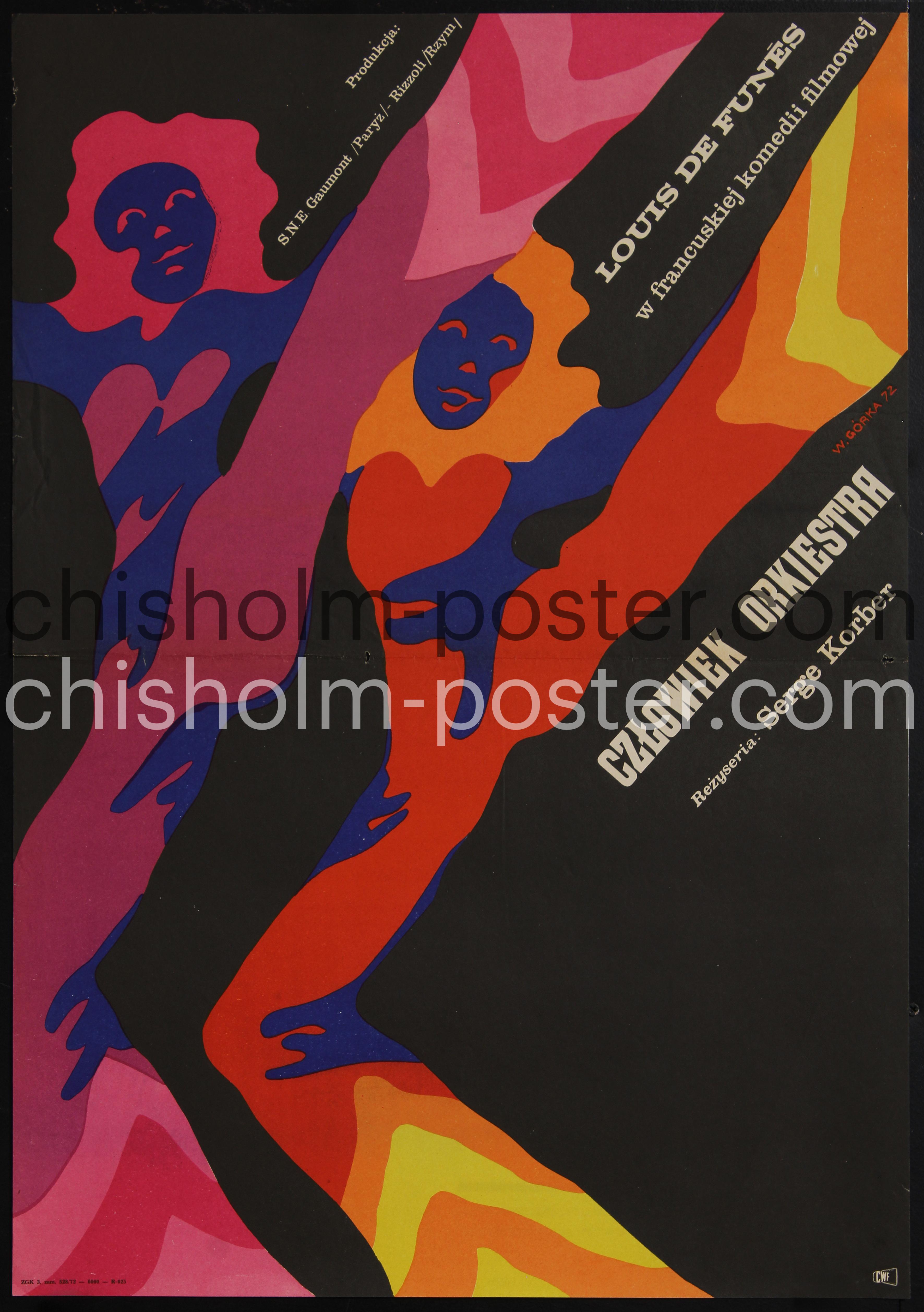1970. Polish release poster for L'homme orchestre, a comedy film from 1970 directed by Serge Korber, written by Jean Halain, and starring by Louis de Funès. It tells the story of Evan Evans, who owns and manages a ballet company in the Principality of Monaco with an iron fist.