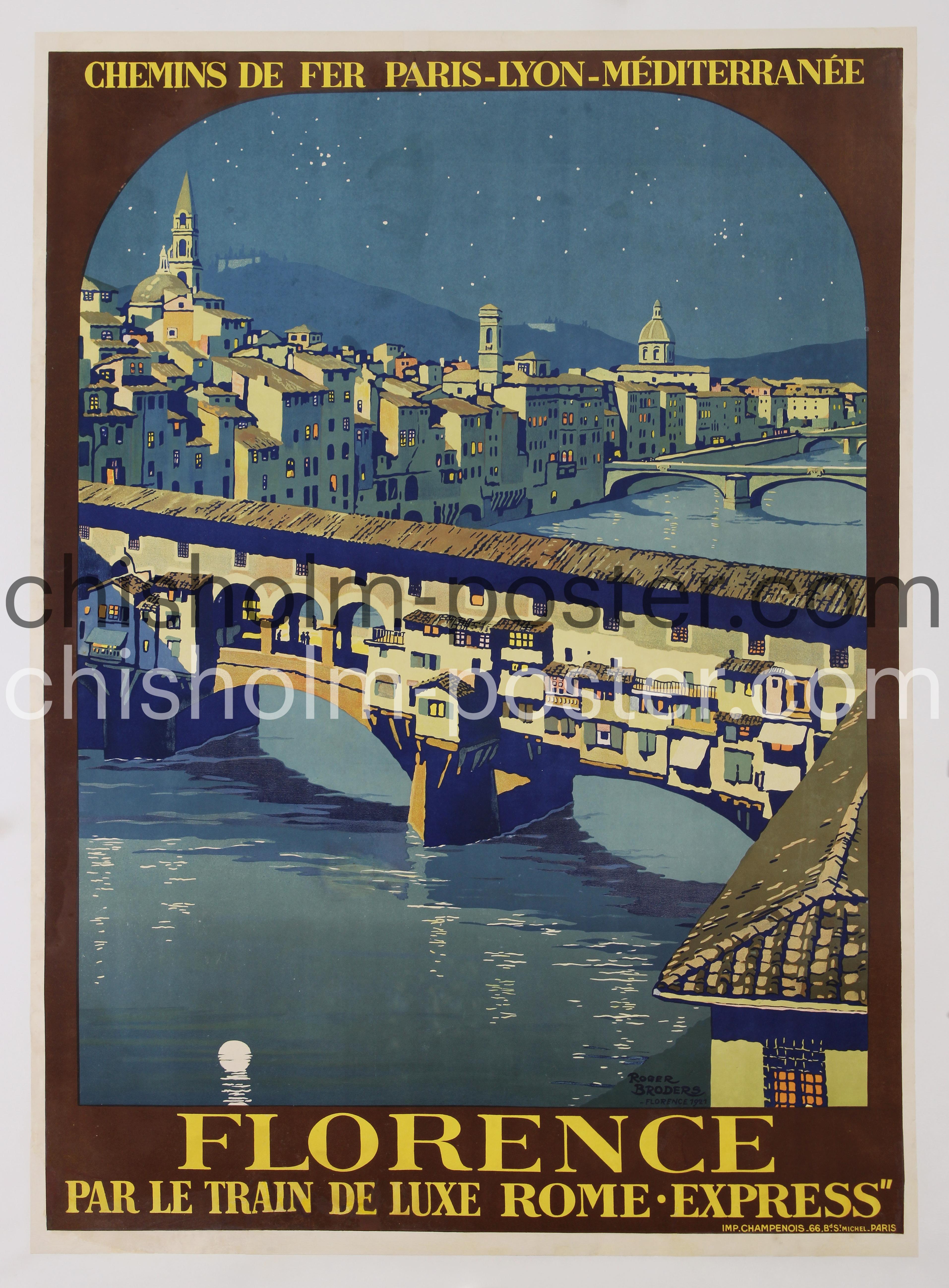 Florence Par Le Train de Luxe Rome-Express. c.1921 Lovely French original lithographic travel poster by Roger Broders, commissioned by the Paris-Lyon-Méditerrannée (PLM) railway for their luxurious Rome Express service, depicting Florence's iconic Ponte Vecchio over the Arno River at night, showcasing elegant Art Deco travel to Italy.
