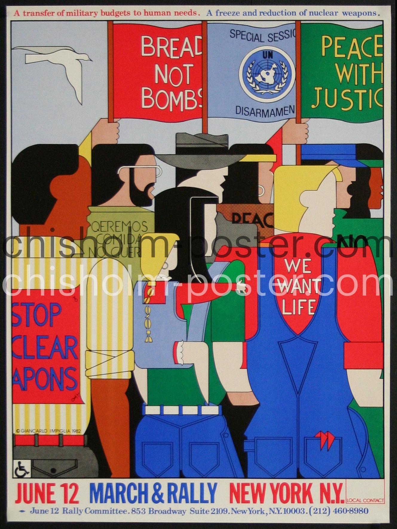 Original poster for the 1982 Peace and Justice Disarmament Rally. Upwards of one million people demonstrated in New York City's Central Park June 12, 1982 against nuclear weapons and for an end to the cold war arms race. It was the largest anti-nuclear protest in American history. The rally and subsequent march were organized around the United Nations Second Special Session on Disarmament. While nuclear disarmament was the main focus of the rally, many in attendance expressed the belief that nuclear weapons were indeed linked to other social justice issues. For many black participants, there was a direct link between the money President Reagan was spending on nuclear weapons and poverty in their communities. From the larger issue of militarism to Reagan’s support for death squads in El Salvador, the rally was intersectional. (Source: armscontrol.org) The artist of this poster, Giancarlo Impiglia, was born in Rome, Italy. He studied at the Art Lyceum and the Academy of Fine Arts of Rome before completing his studies at the Italian Centre of Cinematography. In the early 1970s he moved to the United States, and has since established himself as one of the most prominent artists in the American art scene, delivering powerful commentary on social, political, and economic contemporary culture with a signature style identifiable around the world.