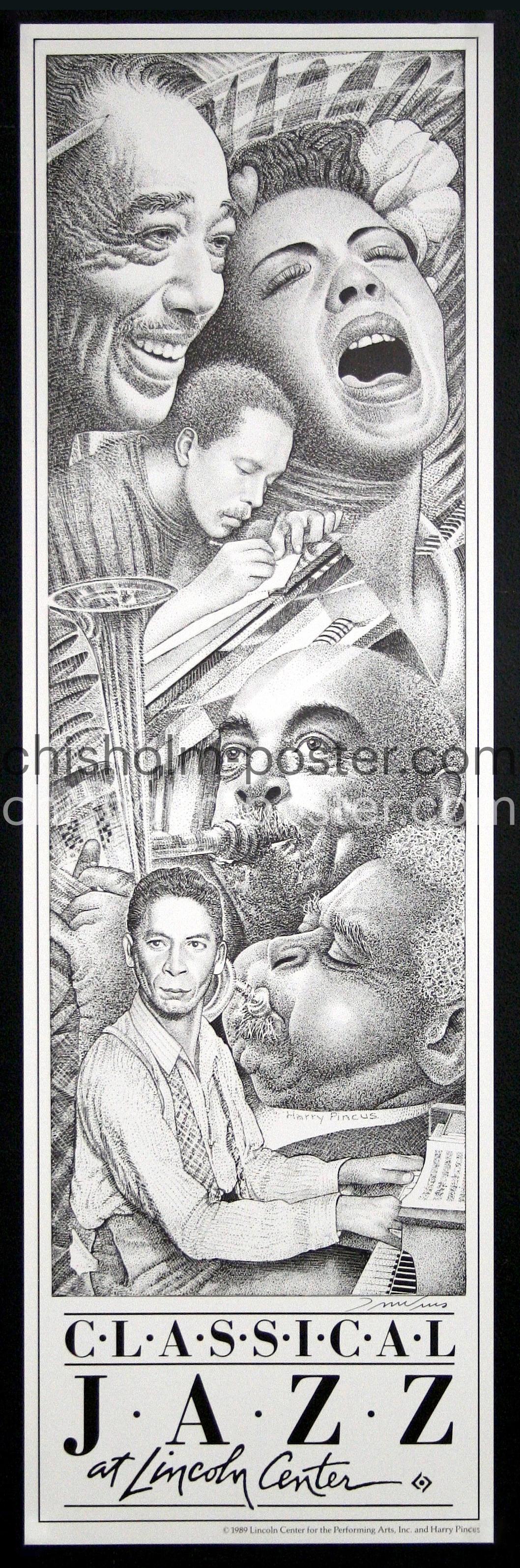 This handsome 1989 work is hand-signed by New York artist Harry Pincus. Among others the artwork depicts Duke Ellington, Billie Holiday, and Dizzy Gillespie.