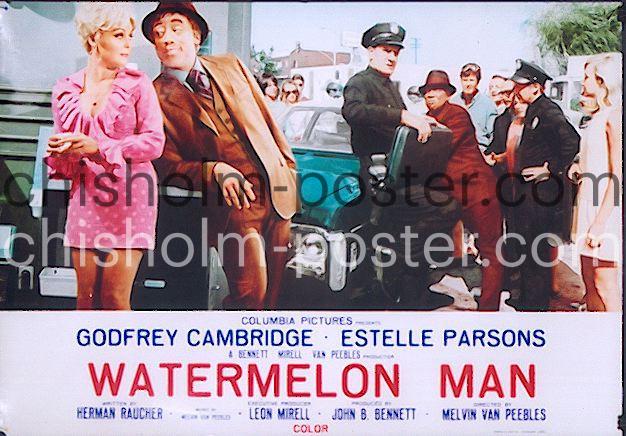 Italian release poster. "Watermelon Man is a 1970 American comedy film directed by Melvin Van Peebles and starring Godfrey Cambridge, Estelle Parsons, Howard Caine, D'Urville Martin, Kay Kimberley, Mantan Moreland, and Erin Moran. Written by Herman Raucher, it tells the story of an extremely bigoted 1960s or 1970s-era white insurance salesman named Jeff Gerber, who wakes up one morning to find that he has become black. The premise for the film was inspired by Franz Kafka's Metamorphosis, and by John Howard Griffin's autobiographical Black Like Me. Van Peebles' only studio film, Watermelon Man was a financial success, but Van Peebles did not accept Columbia Pictures' three-picture contract, instead developing the independent film Sweet Sweetback's Baadasssss Song. The music for Watermelon Man, written and performed by Van Peebles, was released on a soundtrack album, which spawned the single "Love, That's America"." (Wikipedia)