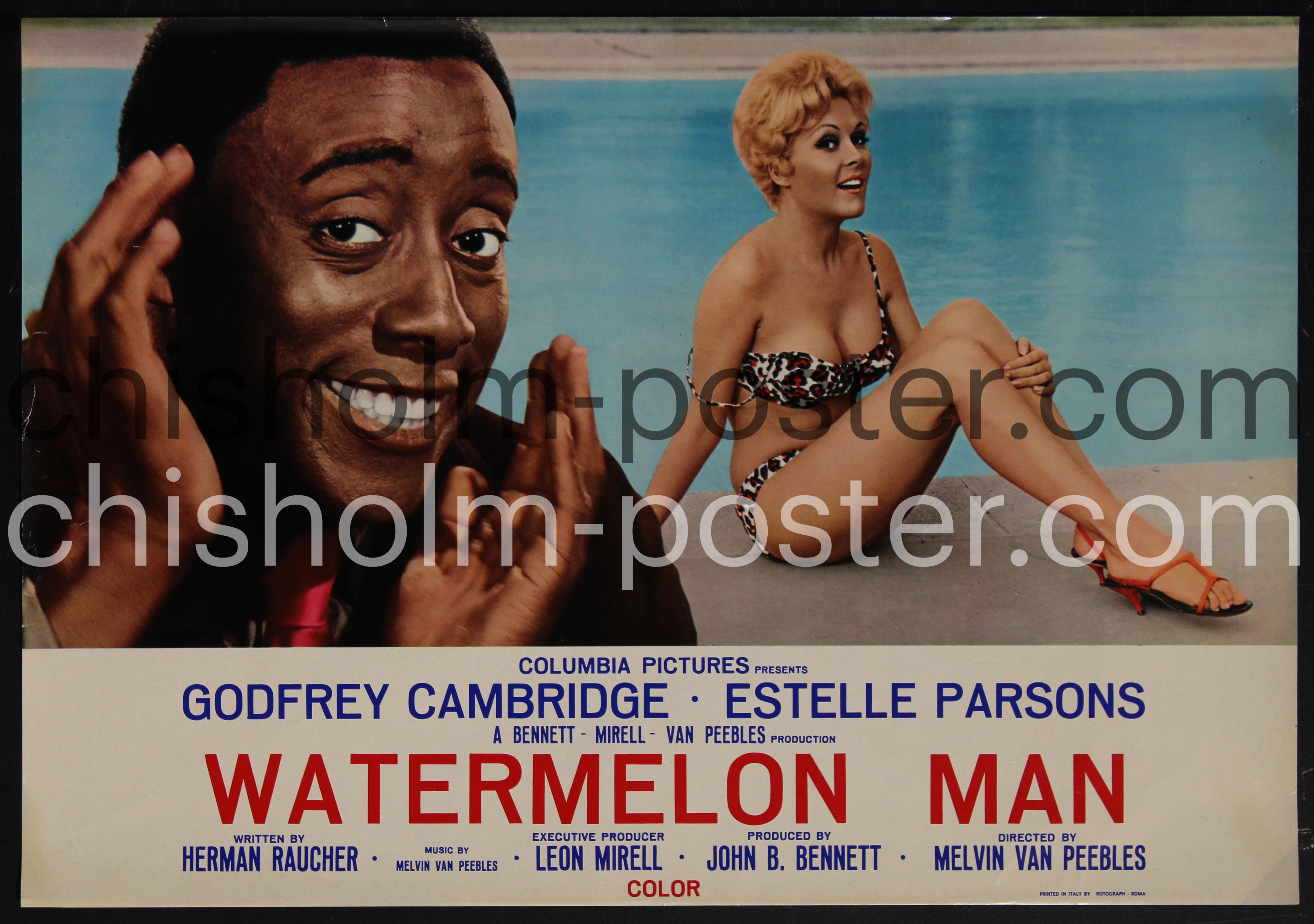 Italian release poster. "Watermelon Man is a 1970 American comedy film directed by Melvin Van Peebles and starring Godfrey Cambridge, Estelle Parsons, Howard Caine, D'Urville Martin, Kay Kimberley, Mantan Moreland, and Erin Moran. Written by Herman Raucher, it tells the story of an extremely bigoted 1960s or 1970s-era white insurance salesman named Jeff Gerber, who wakes up one morning to find that he has become black. The premise for the film was inspired by Franz Kafka's Metamorphosis, and by John Howard Griffin's autobiographical Black Like Me. Van Peebles' only studio film, Watermelon Man was a financial success, but Van Peebles did not accept Columbia Pictures' three-picture contract, instead developing the independent film Sweet Sweetback's Baadasssss Song. The music for Watermelon Man, written and performed by Van Peebles, was released on a soundtrack album, which spawned the single "Love, That's America"." (Wikipedia)