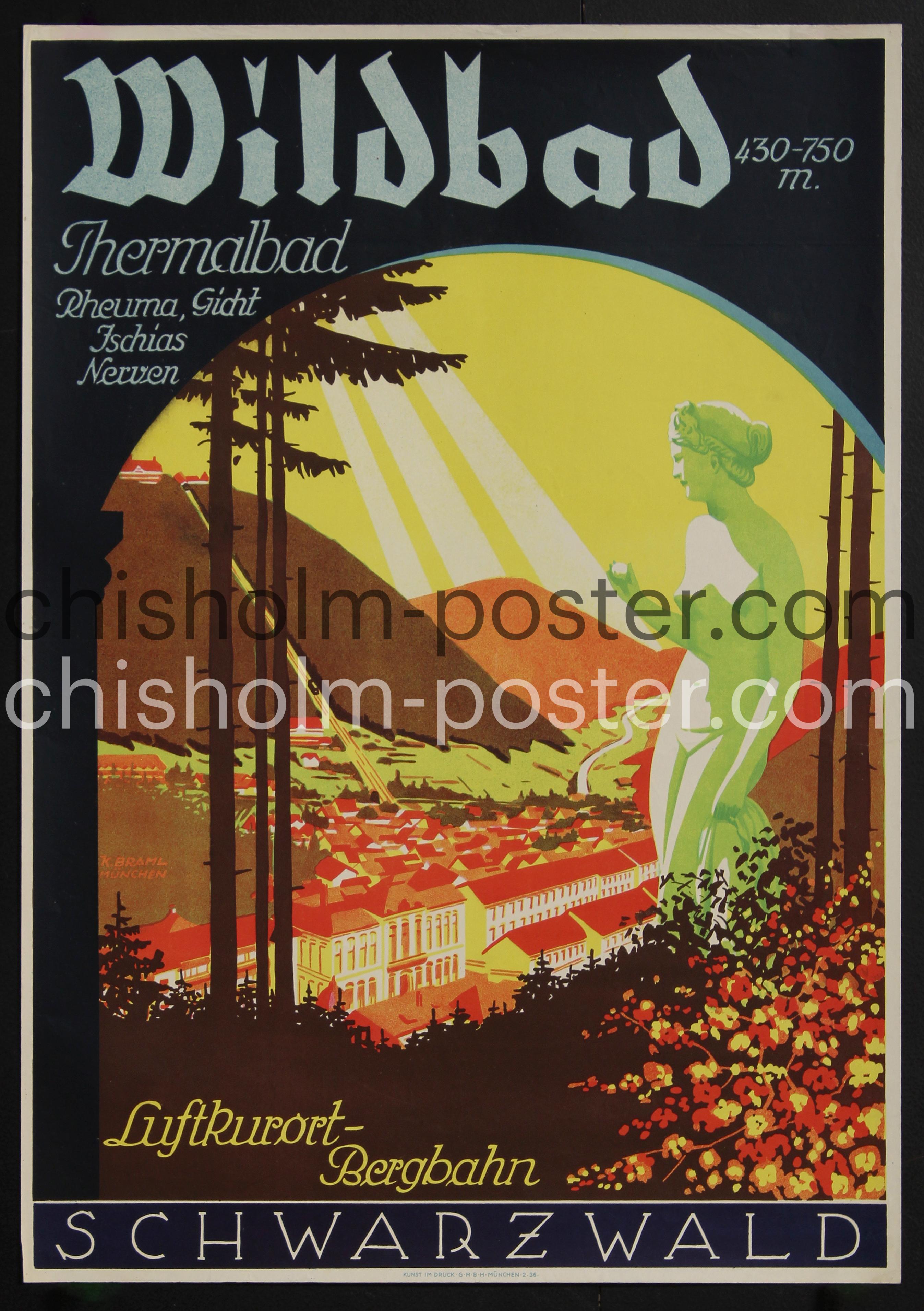 German travel poster promoting tourism to Bad Wildbad, a spa town in Germany, in the state of Baden-Württemberg.
