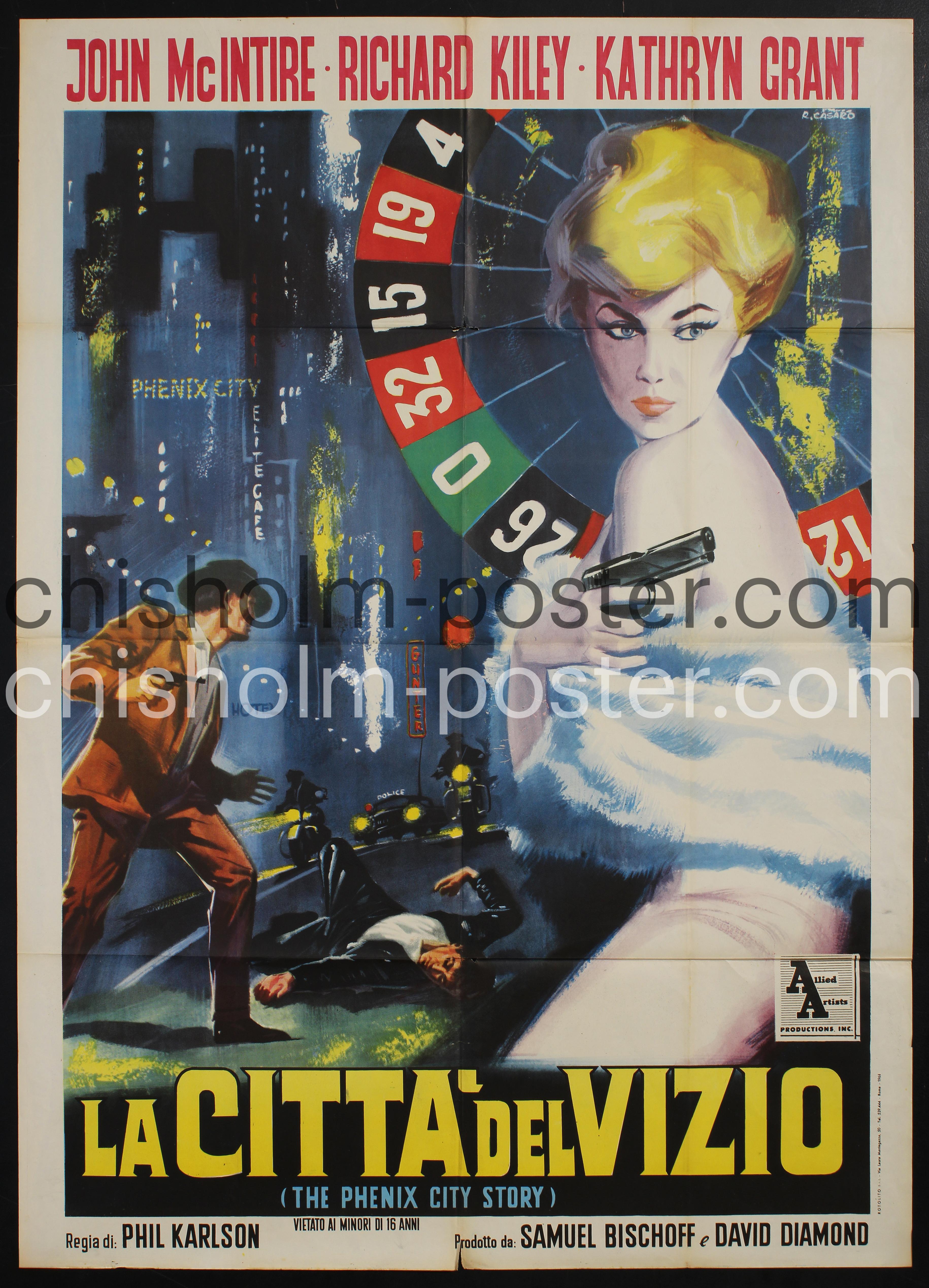 1955 Phil Karlson Alabama newspaper journalism reporter crime film noir melodrama. PLOT: A crime-busting lawyer and his initially reluctant attorney father take on the forces that run gambling and prostitution in their small Southern town. Fantastic graphics by Renato Casaro of a sexy femme-fatal in front of a roulette wheel.