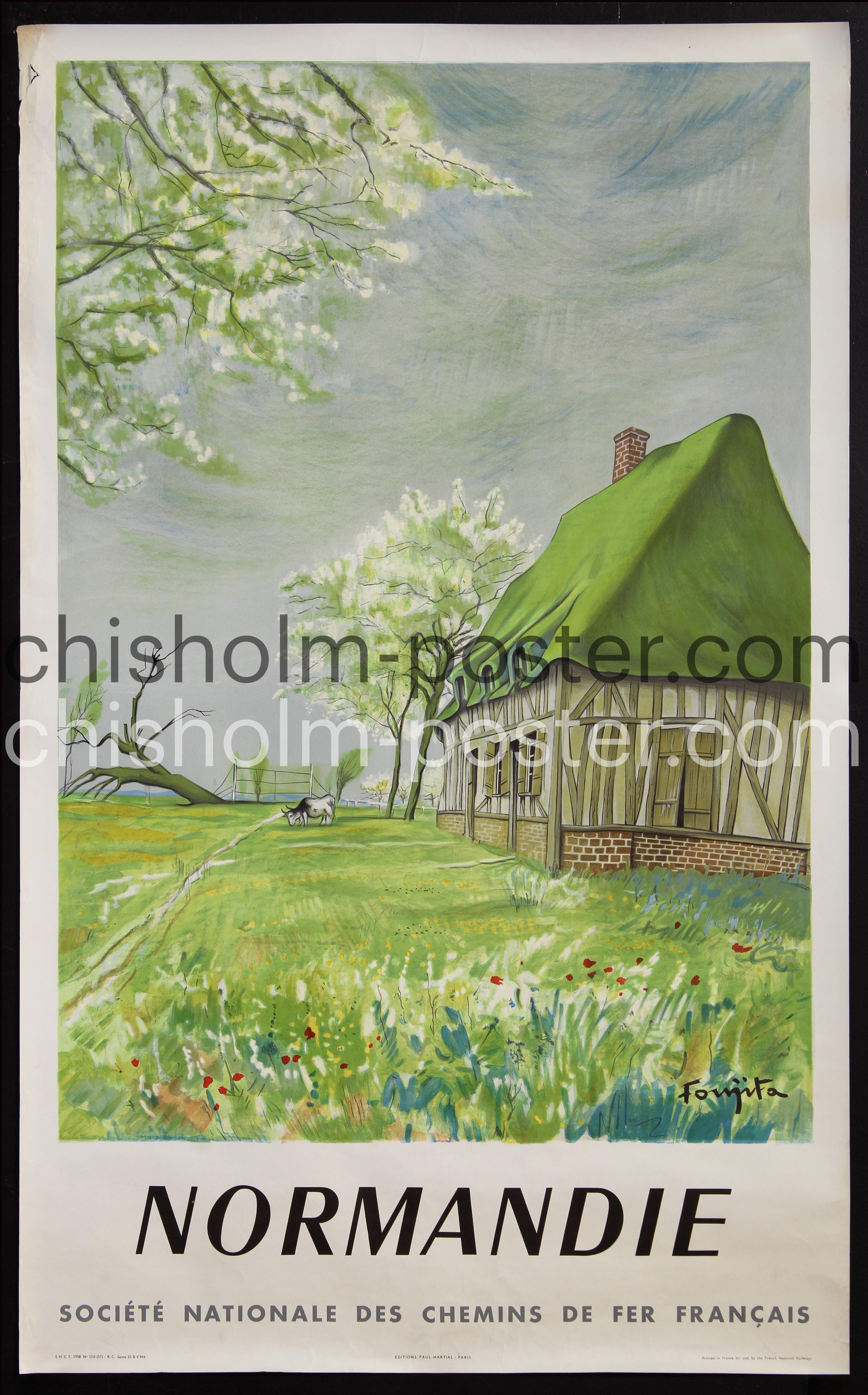 Keywords: Travel promotion,cottage,thatched roof,cows,farm,country,green,fields and flowers,trees,SNCF,S.N.C.F.,Tsuguharu Foujita