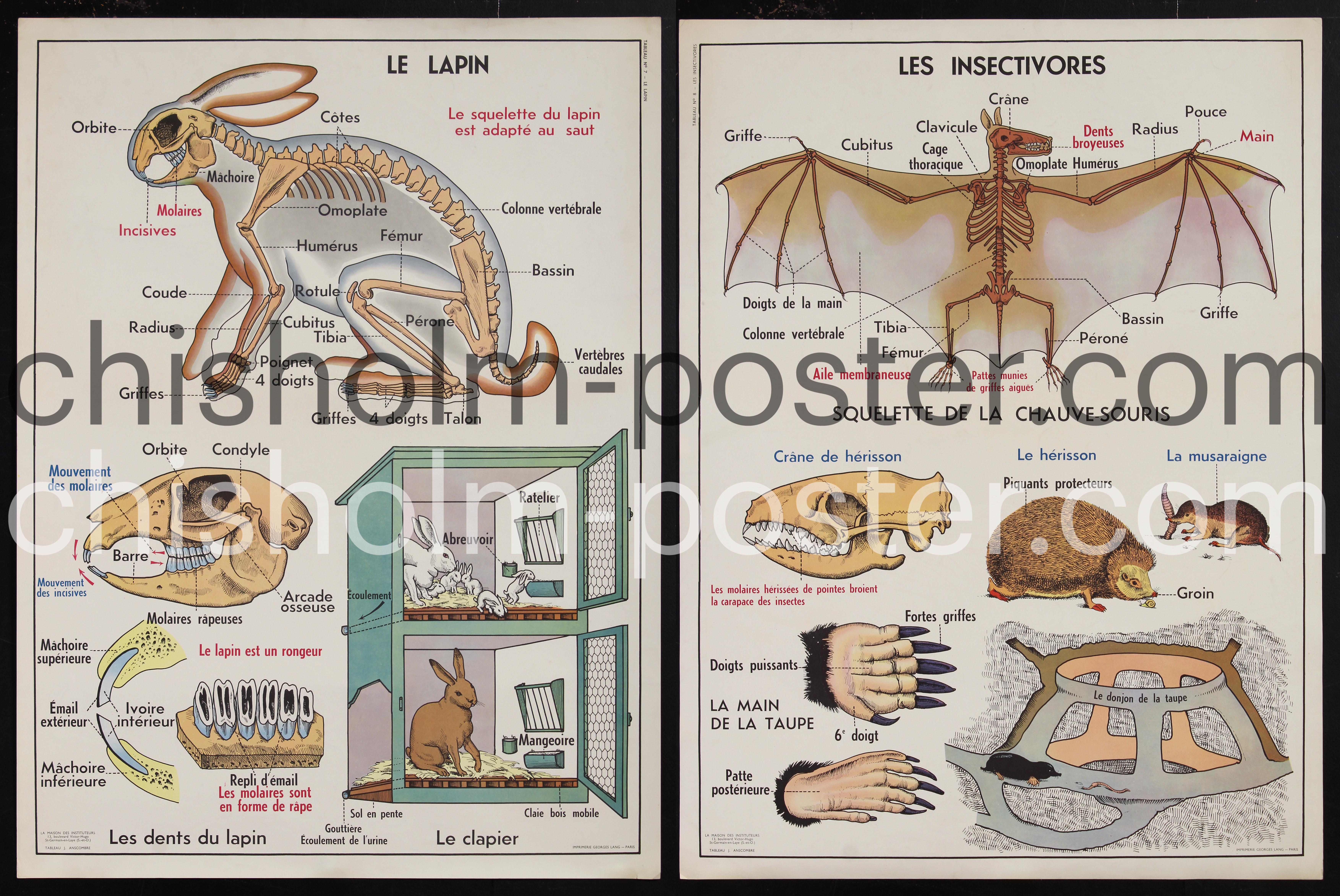 1961 Double sided French education poster printed to be distributed in schools with anatomy of rabbits and insectivores (including small nocturnal animals like bats and moles).