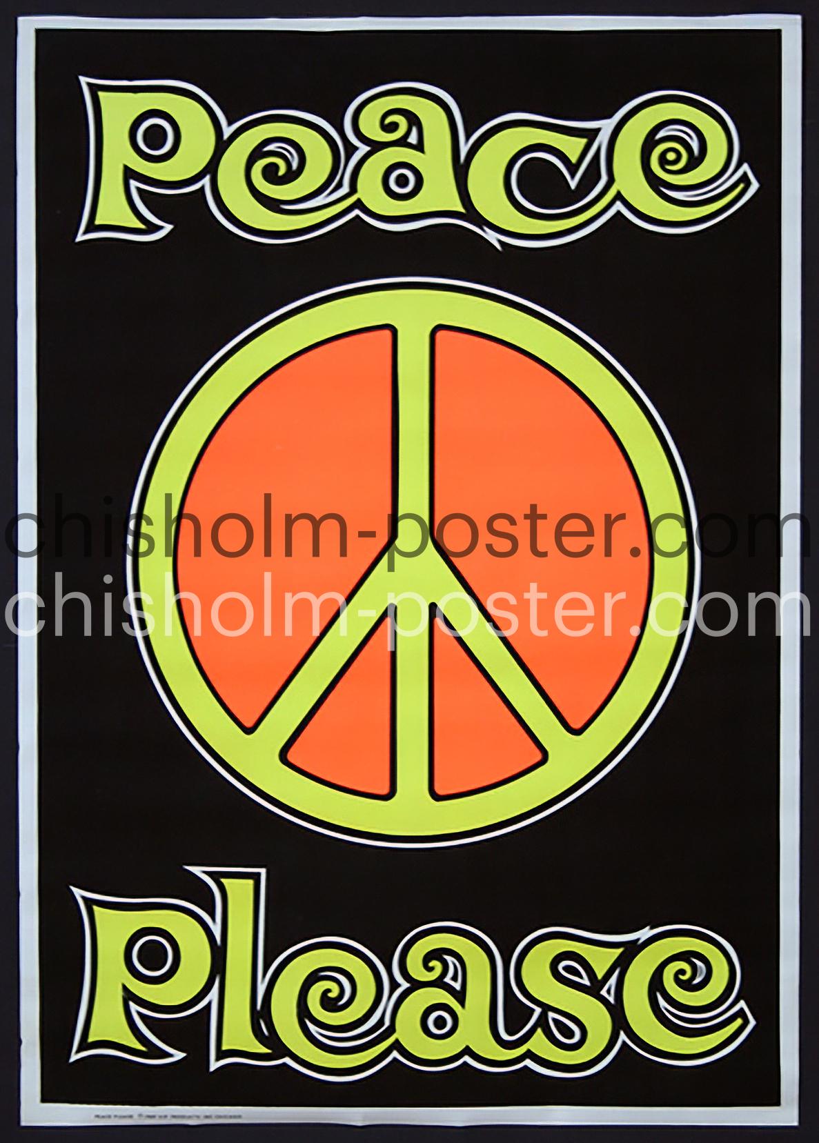 c.1969 Anti-war blacklight poster from Hip Products Inc Chicago. "Over the past five decades the peace sign has become one of the world's enduring icons. The original peace sign was developed in 1958 by a British textile designer and conscientious objector named Gerald Holtom. He created the symbol by combining the semaphore letters N and D, for nuclear disarmament. On Feb. 21, 1958 the symbol was accepted by the Direct Action Committee Against Nuclear War. The symbol soon began to be used in anti-nuclear protests across Britain and then spread across the globe." (democracynow.org)
