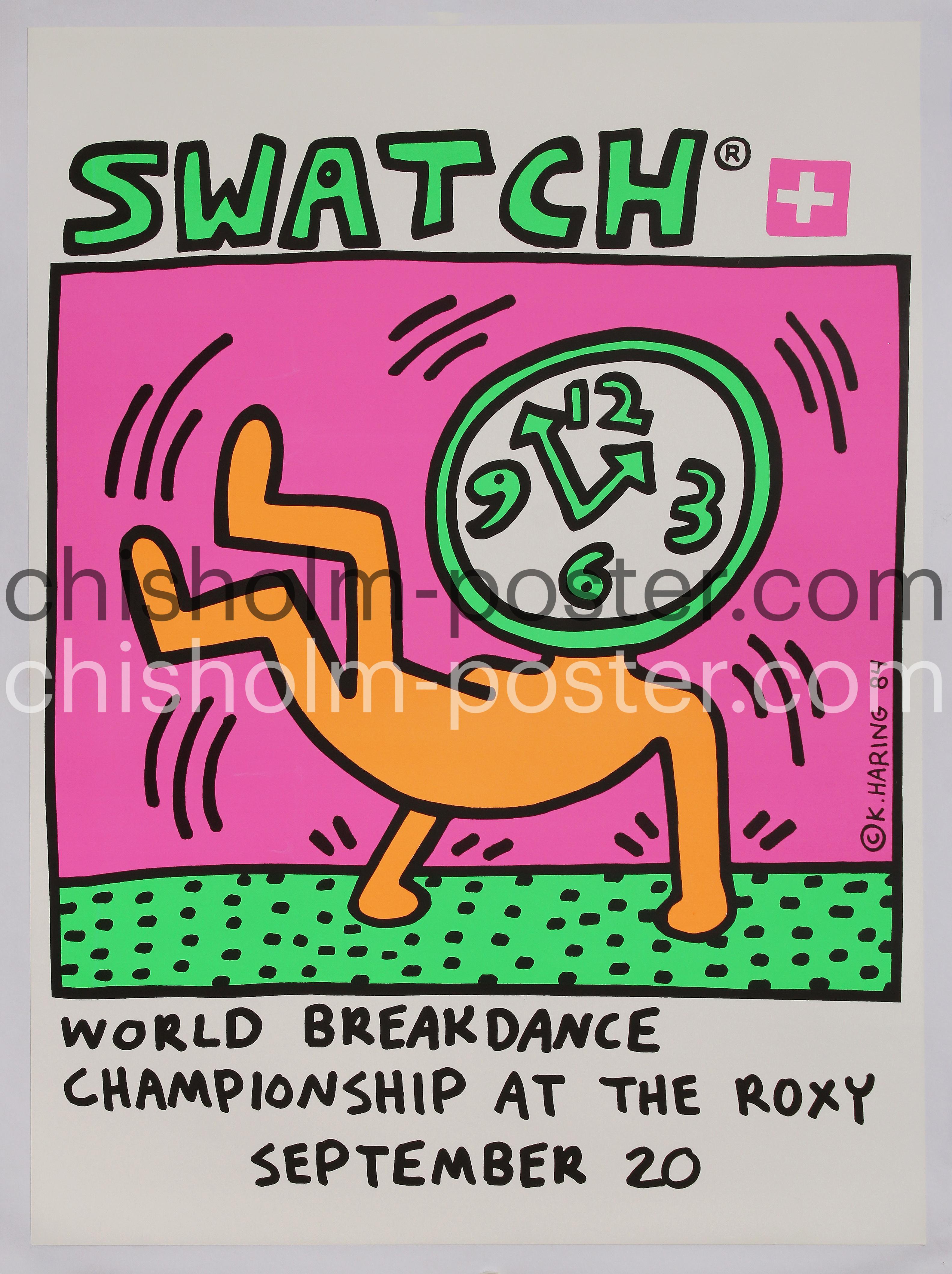 Poster for the 1984 Swatch World Breakdance Championship, a landmark hip-hop event held at The Roxy in New York City on September 20, 1984. The iconic poster was designed by Keith Haring.
