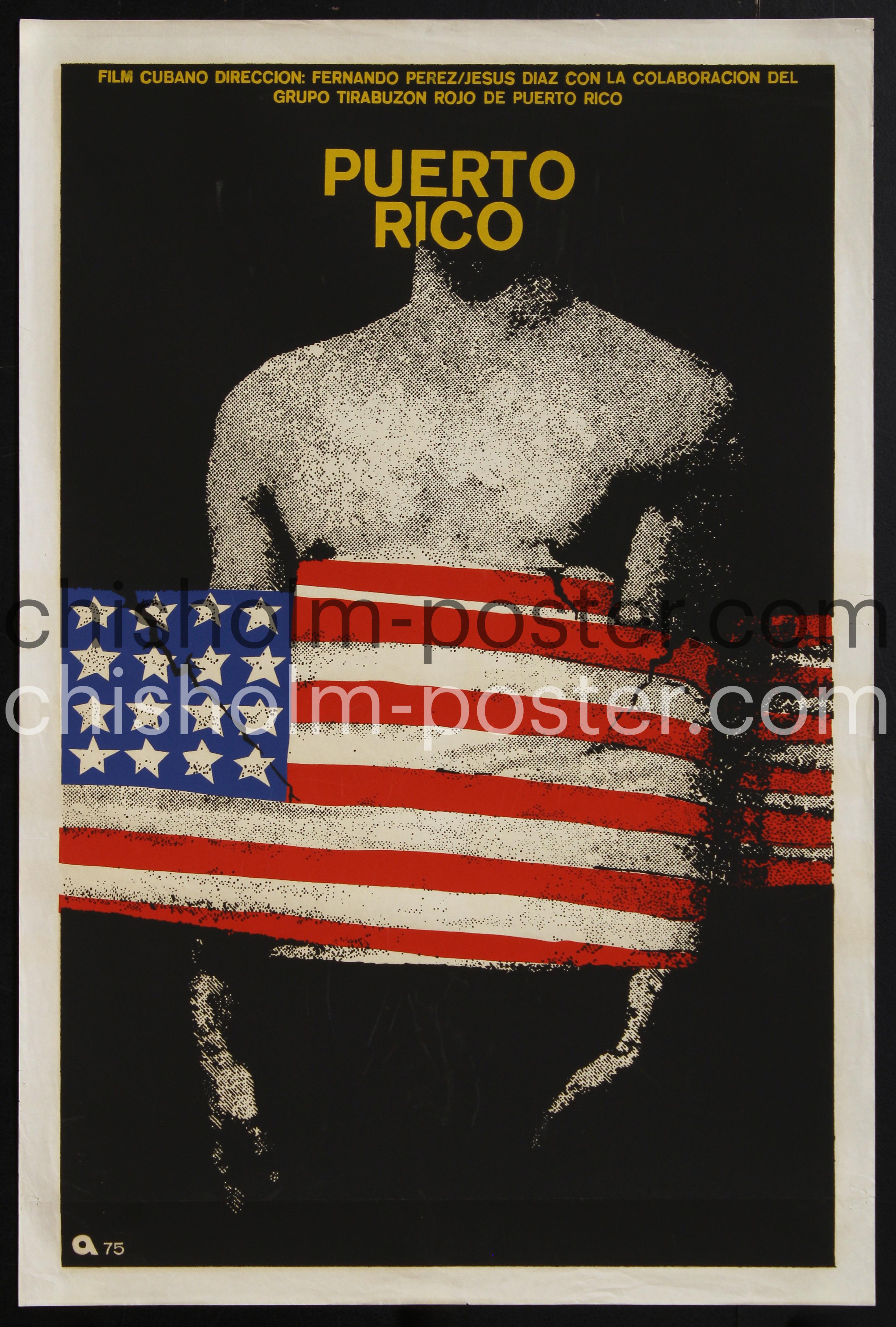 Silkscreen poster for the 1975 documentary Film "Puerto Rico," directed by Fernando Pérez and Jesús Díaz, a socio-economic analysis of the island's history and anti-colonial struggle, using archival footage and interviews to explore U.S. involvement and its cultural impact, with contributions from Cuban filmmaker Fernando Pérez and Puerto Rican artist Jesus Díaz for the ICAIC.