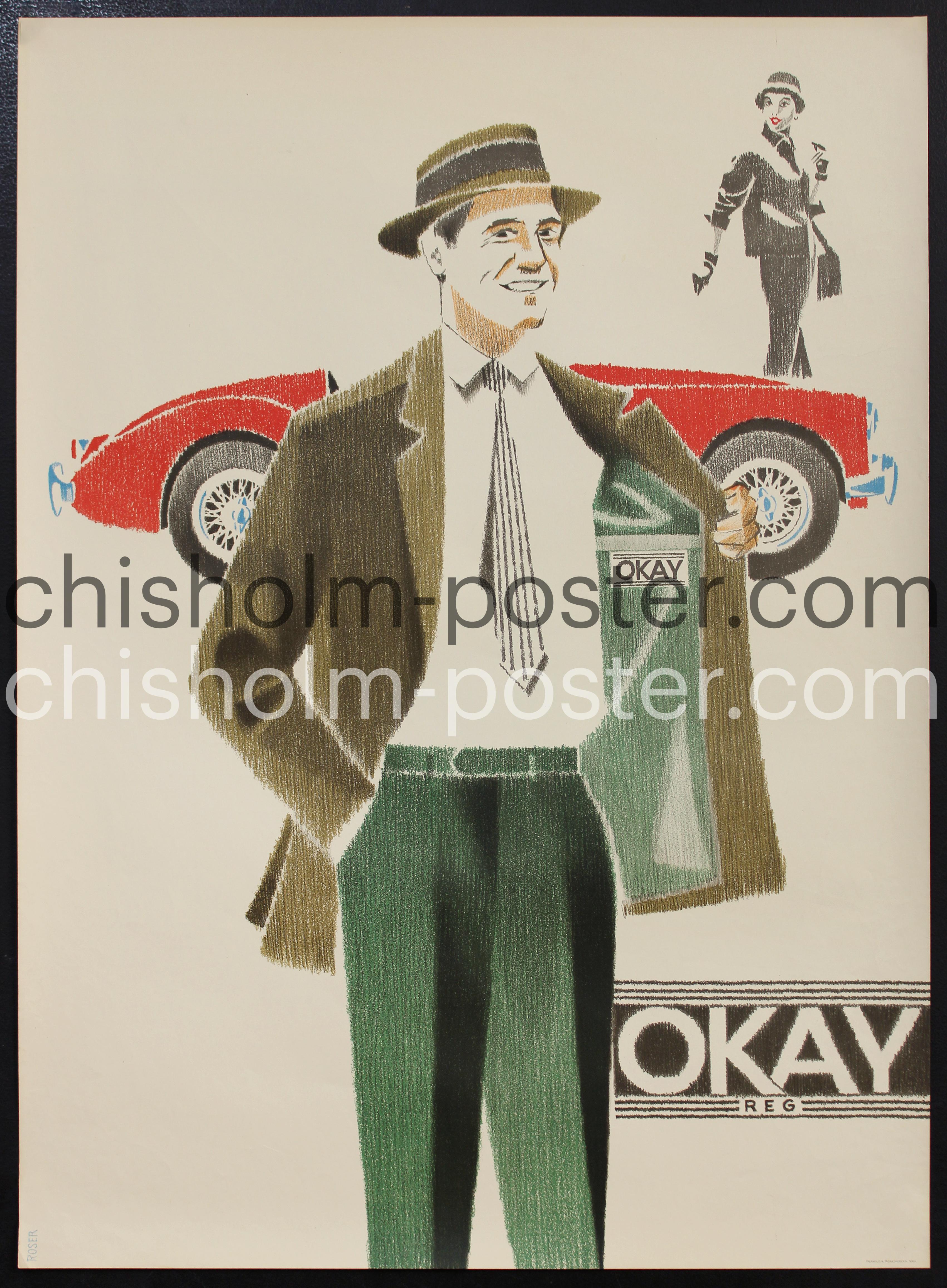 1950's Danish men's fashion poster showing a man exposing his coat lining with a red convertible and woman in the background.
