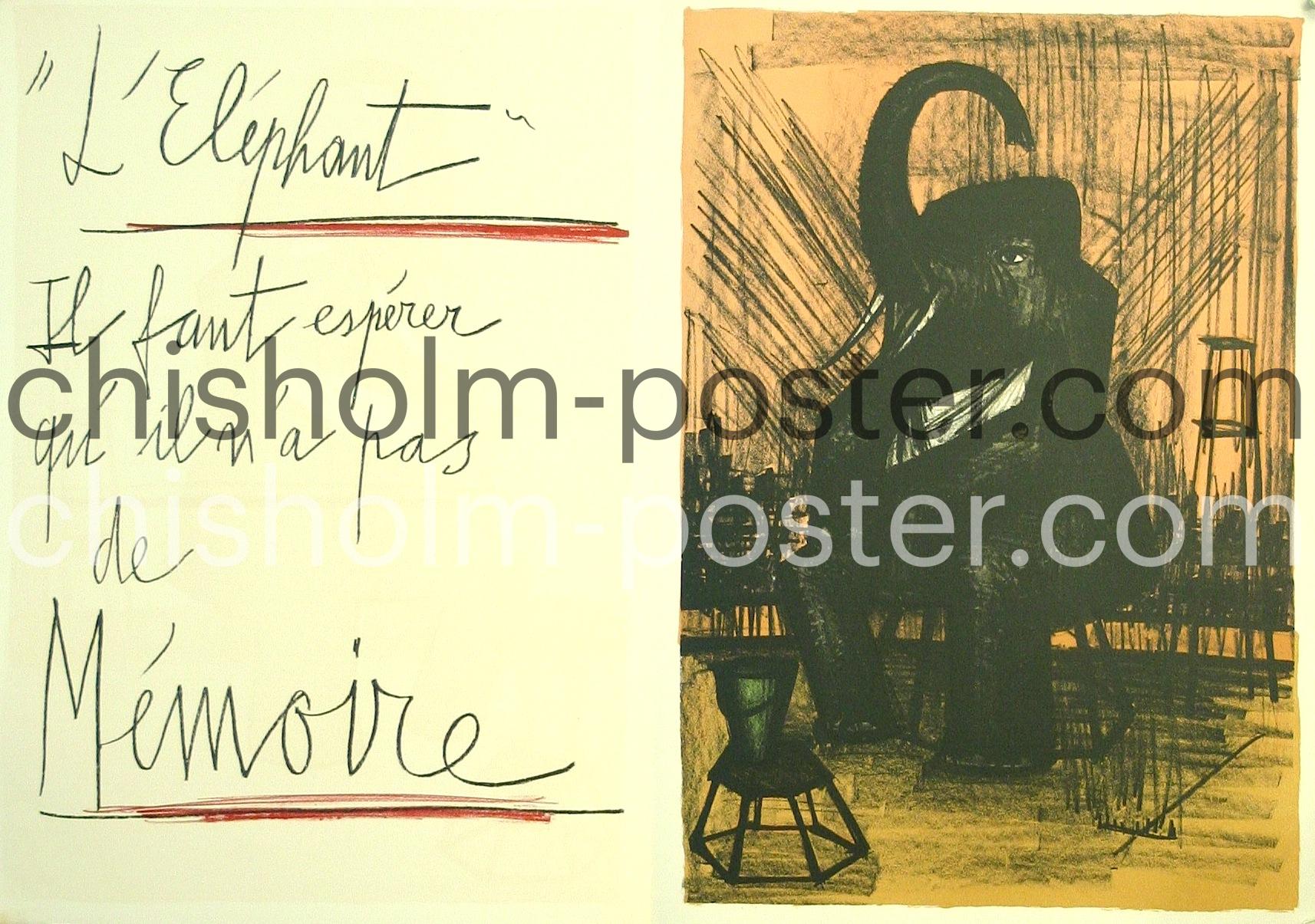 1968, Beautifully printed portfolio page, folded down the center with the title "L'Elephant" on the cover. "Il faut esperer qu'il n'a pas de memoire". A page from "Mon Cirque", a 1968 portfolio by French artist Bernard Buffet, featuring original lithographs of circus performers and clowns. The portfolio, originally produced by Mourlot, reflects Buffet's signature style of thick, black outlines and austere figurative paintings.