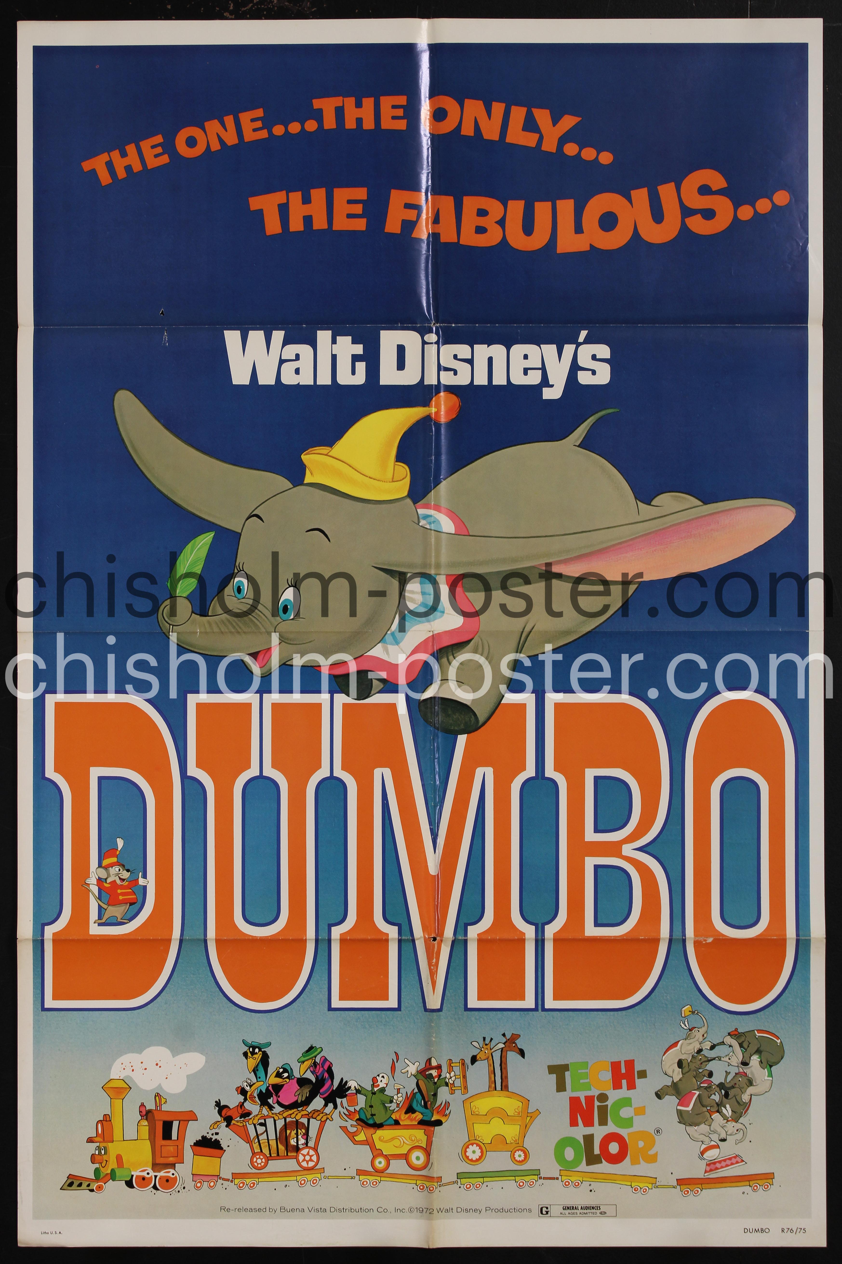 1975 Re-release poster for Dumbo, the classic 1941 American animated fantasy drama film produced by Walt Disney Productions and released by RKO Radio Pictures. "The film is based upon the storyline written by Helen Aberson and Harold Pearl, and illustrated by Helen Durney for the prototype of a novelty toy ("Roll-a-Book"). The main character is Jumbo Jr., an elephant who is ridiculed for his oversized ears and mockingly nicknamed "Dumbo", but in fact he is capable of flying by using his ears as wings. Throughout most of the film, his only true friend, aside from his mother, is a mouse named Timothy – a relationship parodying the stereotypical animosity between mice and elephants." (Wikipedia)