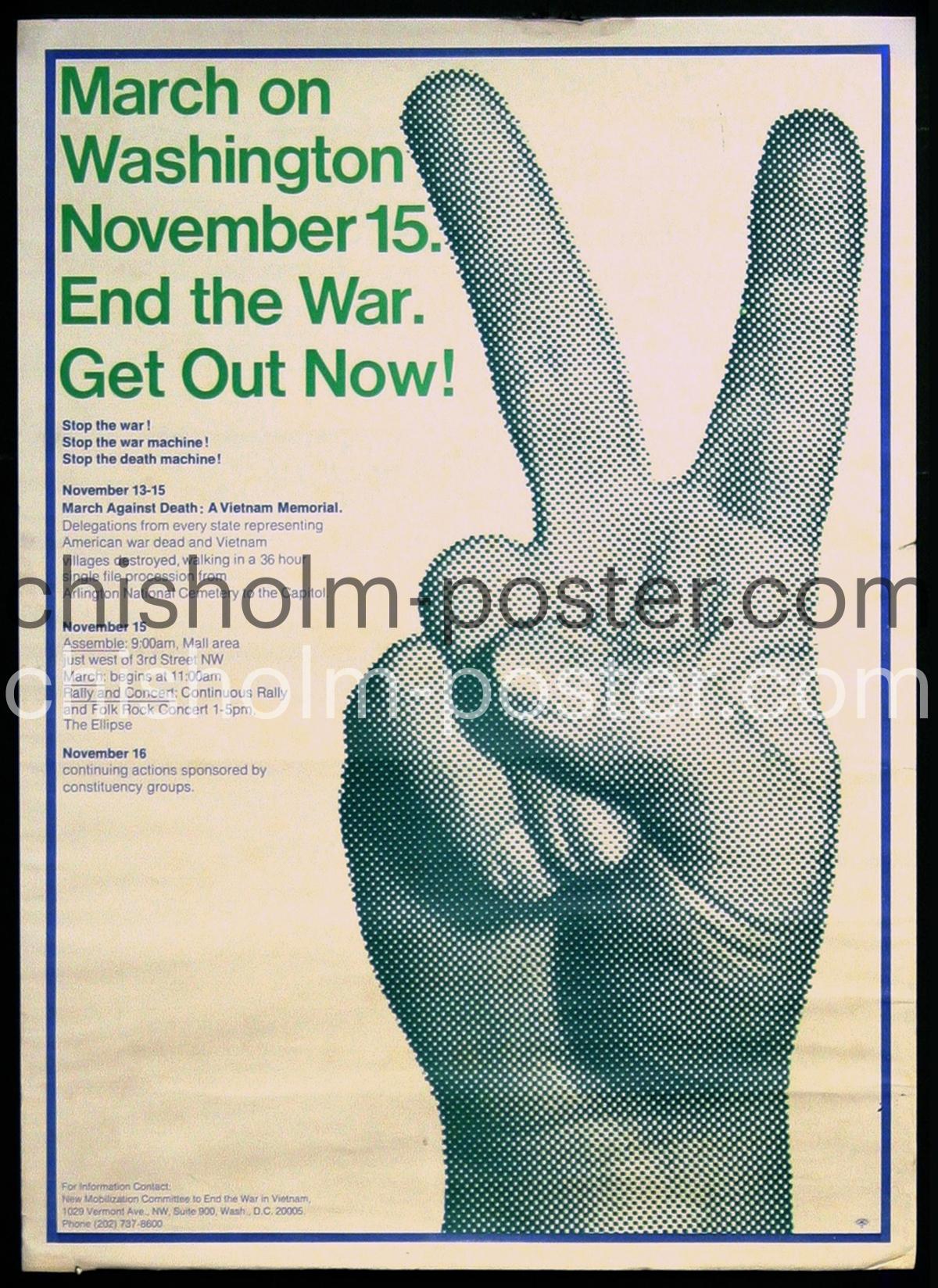 Iconic poster for anti-war events that took place November 13-15, 1969. During the Vietnam War the "V sign" with palm outward was widely adopted by the counterculture as a symbol of peace and is still used today worldwide as the "peace sign". Additional text reads: "March on Washington November 15. End the War. Get Out Now! Stop the war! Stop the war machine! Stop the Death machine! November 13-15 March Against Death: A Vietnam Memorial. Delegations from every state representing American war dead and Vietnam villages destroyed, walking in a 36 hour single file procession from Arlington National Cemetery to the Capitol./ November 15 Assemble: 9:00am, Mall area just west of 3rd Street NW March: begins at 11:00am Rally and Concert: Continuous Rally and Folk Rock Concert 1-5pm. The Ellipse / November 16 continuing actions sponsored by constituency groups.