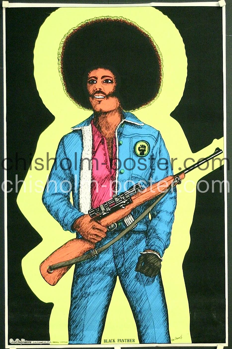 1972 Great black-light headshop poster showing a black panther member holding a shotgun, sporting a full afro and wearing a black fist badge on his jean jacket.