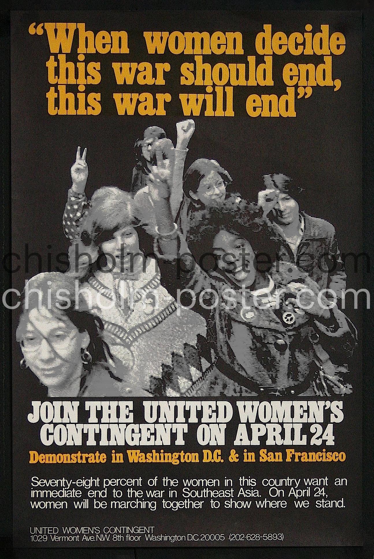 1971 poster calling for women to join a demonstration in Washington D.C. and San Francisco on April 24, 1971 to demand an end to the Vietnam War. Organized by the United Women's Contingent. Additional text reads: "Seventy-eight percent of the women in this country want an immediate end to the war in Southeast Asia. On April 24, women will be marching together to show where we stand."