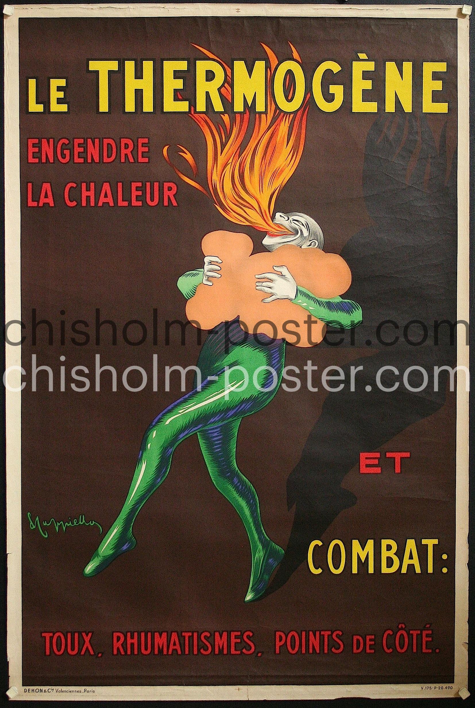 This is a later c.1935 63x47" printing. Designed by the famed Italian artist Leonetto Cappiello, this poster was first published in 1909. It advertises a form of medicated wadding that would be pinned inside of clothes to treat rheumatism, lumbago, coughs, and other aliments. This famous design was used for several decades and many variant printings were produced through the years.