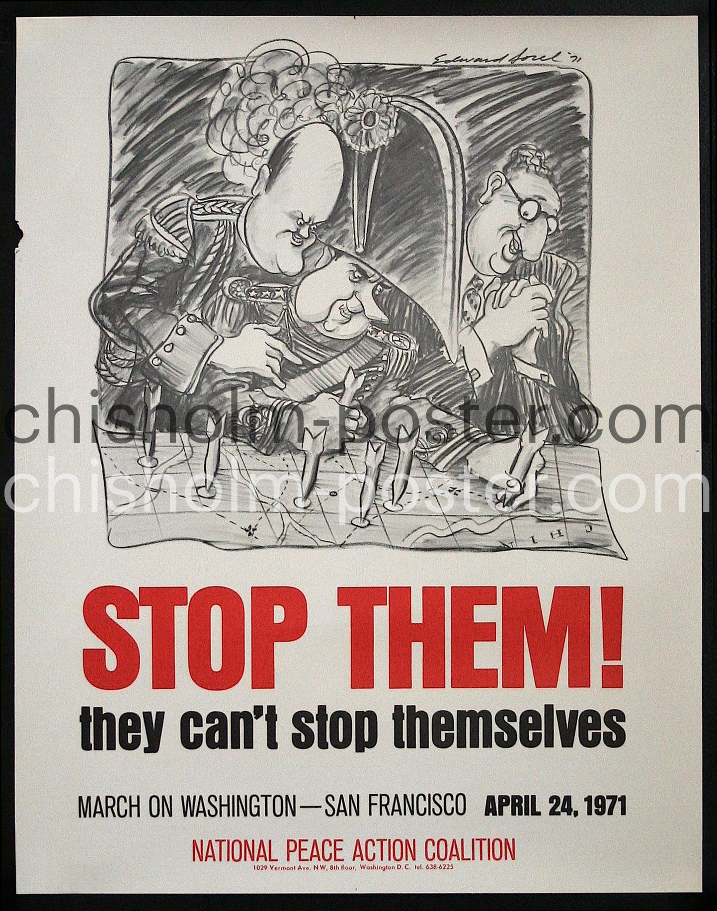 Poster from the National Peace Action Coalition for a March on Washington and San Francisco on April 24, 1971 with caricatures of president Richard Nixon, national security adviser Henry Kissinger, and U.S. Secretary of Defense, Melvin Laird. Satirical illustration by Edward Sorel, an American illustrator, caricaturist, cartoonist, graphic designer and author.