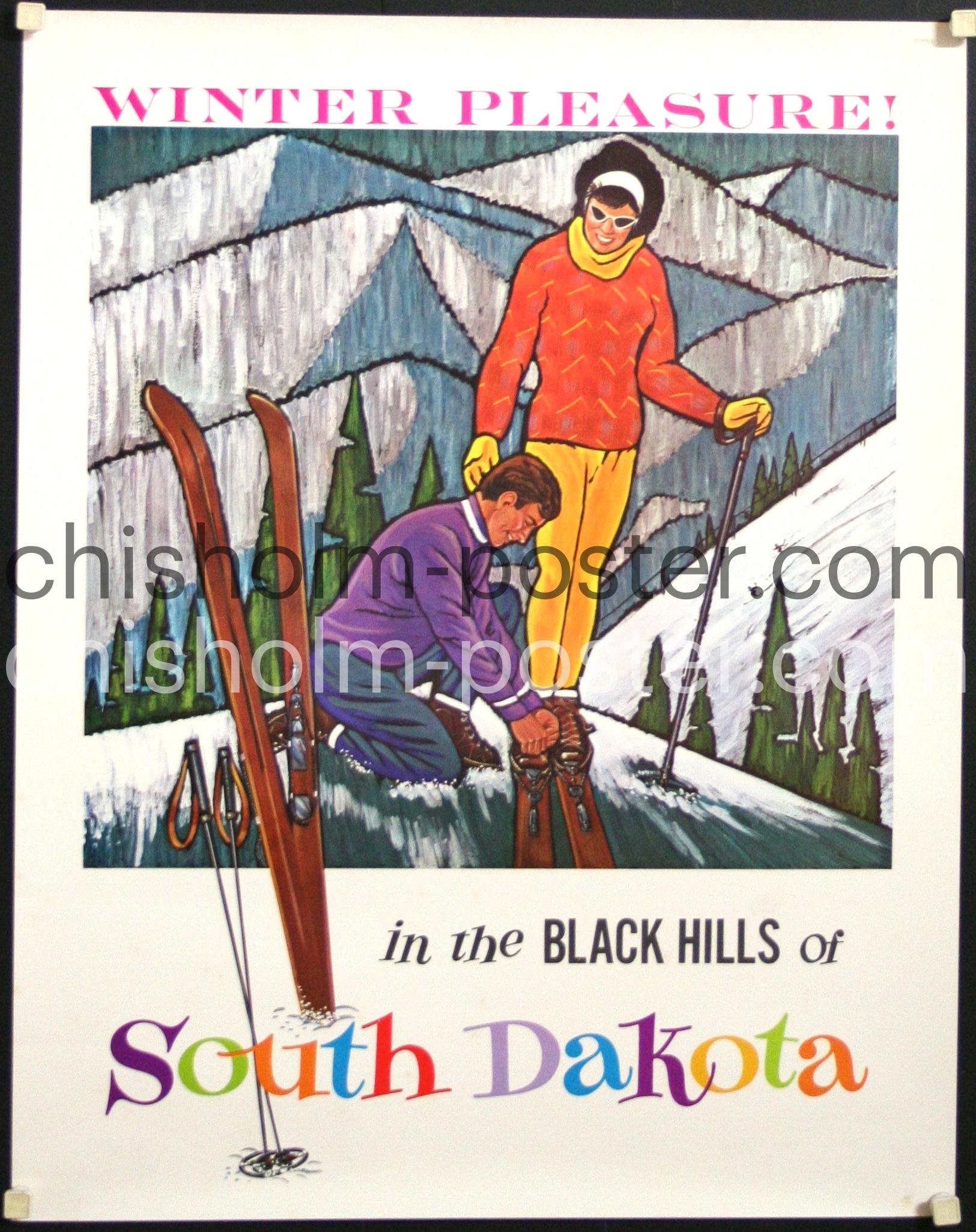 Fashionable skiers buckle up on the slopes of the Black Hills of South Dakota! Great original vintage 1960's travel poster.