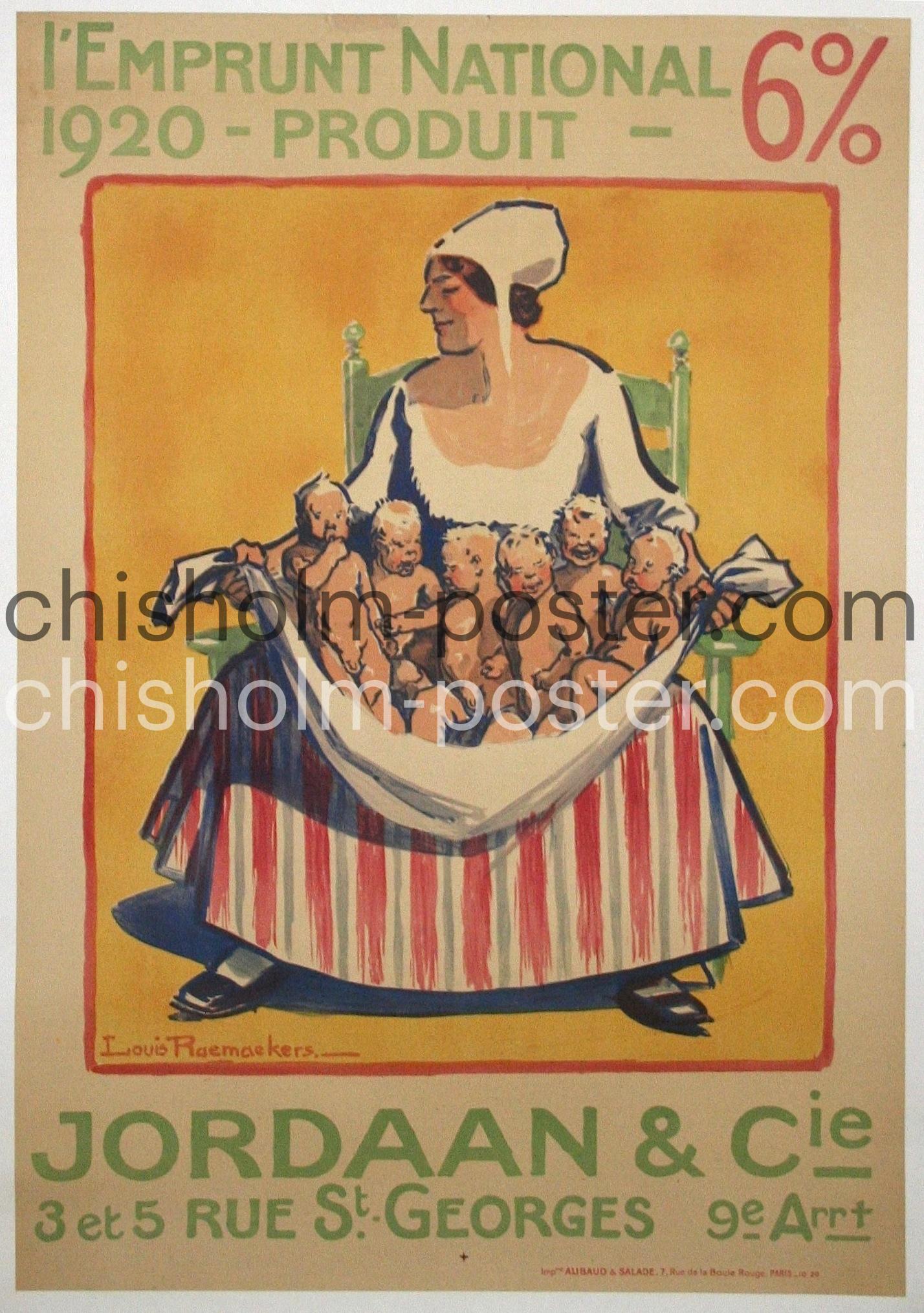 Humorous 1920 National Loans poster for Parisian bank Jordaan & Co. By Louis Raemaekers (April 6, 1869 – July 26, 1956) a Dutch painter and editorial cartoonist for the Amsterdam newspaper De Telegraaf during World War I, and noted for his anti-German stance.