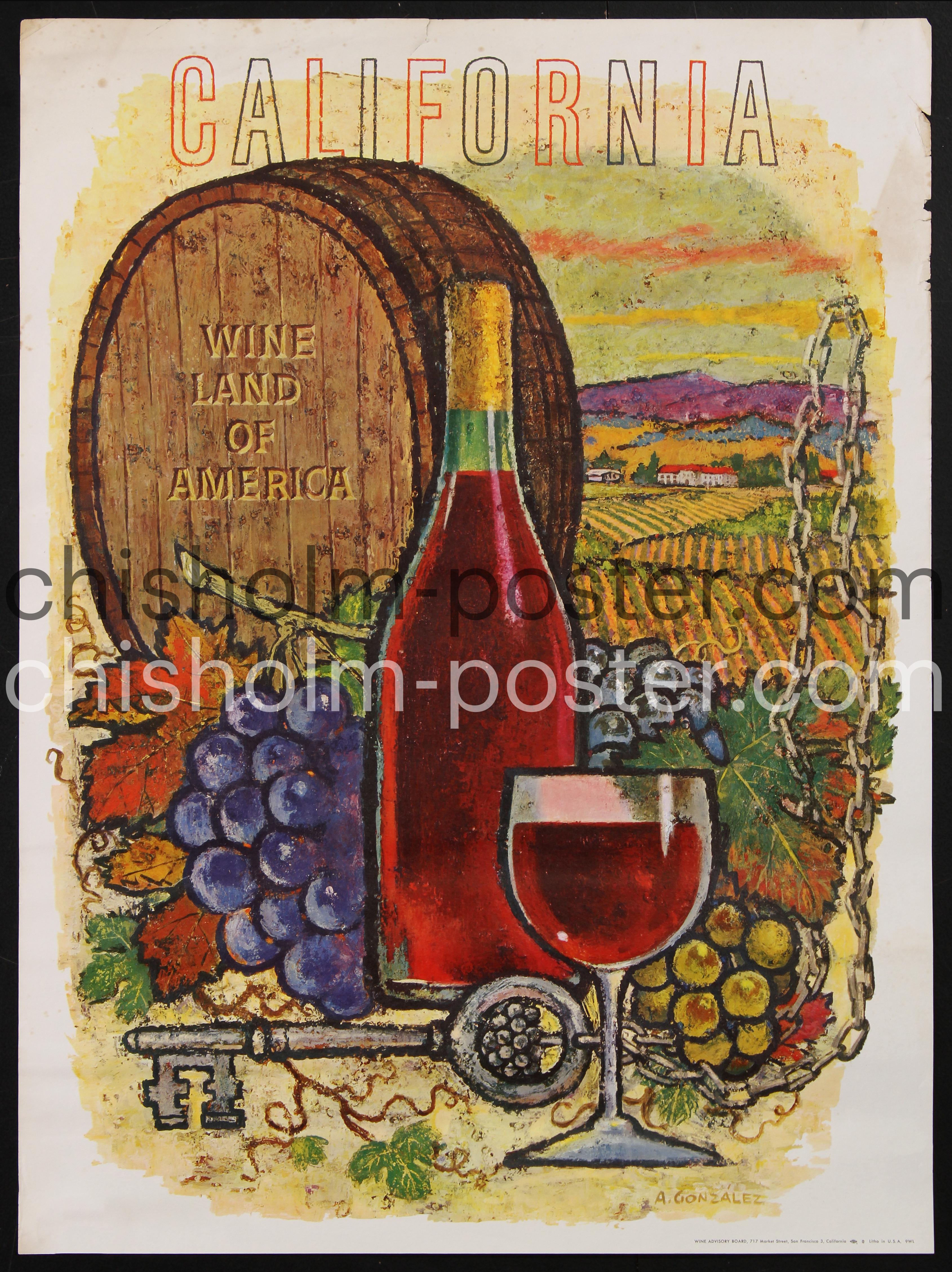 Original vintage poster promoting California Wine published by the California Wine Advisory Board. The artist, Amado Gonzalez (1913 - 2007) was born in Guadalajara, Mexico in 1913. He immigrated to San Francisco in 1927 and worked as a muralist and painter (with the WPA)and later as a commercial artist creating this lovely wine series. "Featuring symbols of the wine industry—a large, oval wine cask, a bottle and glass of red wine, grapes, rolling vineyards, and a cellar key, the poster proclaimed California to be the “Wine Land of America.” Such posters were shown at trade fairs and wine events to promote the emerging, revitalized California wine industry." (Source: Smithsonian)
