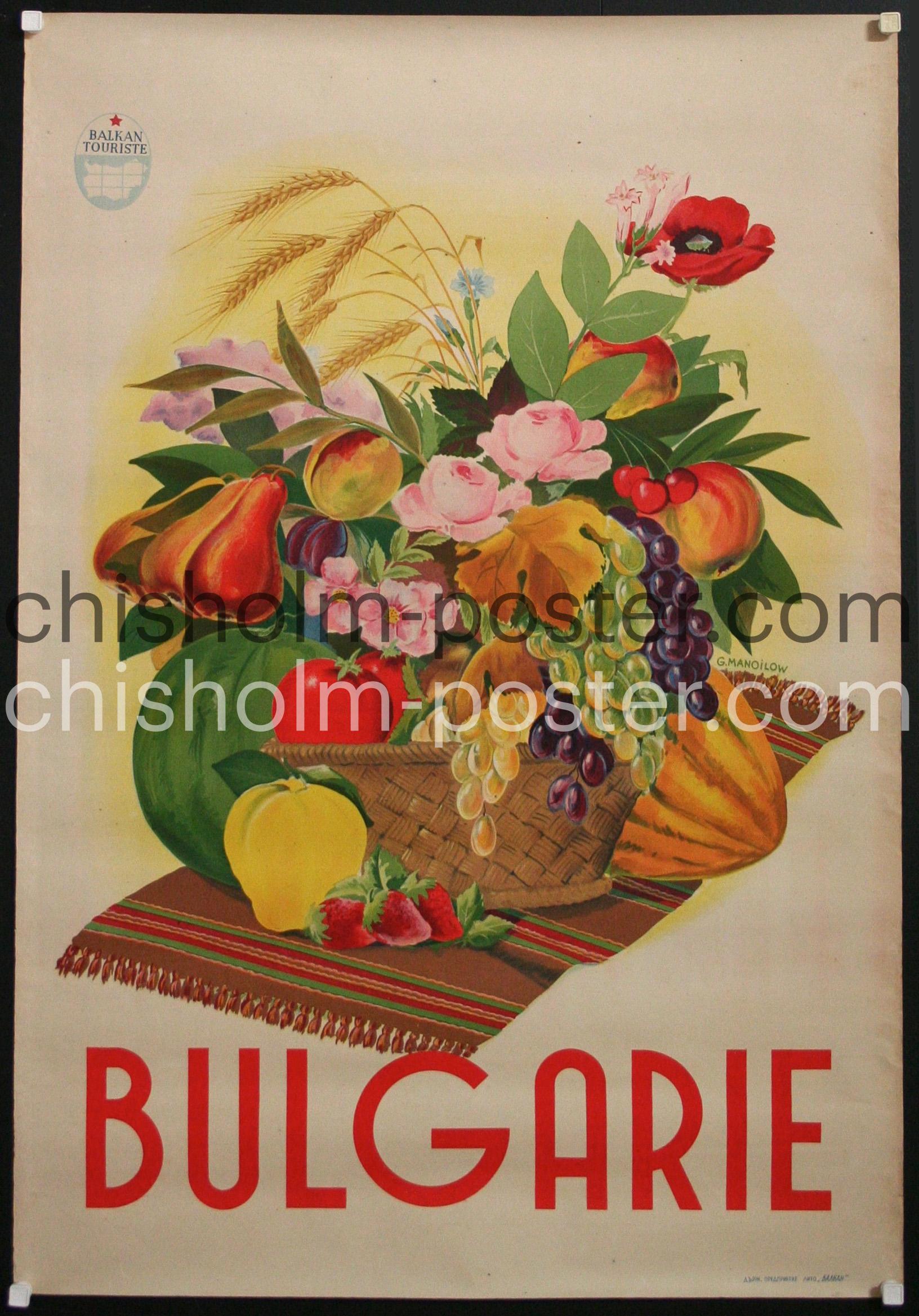 Wonderful bouquet of flowers and fruit promoting travel to Bulgaria. Issued by Balkan Touriste.