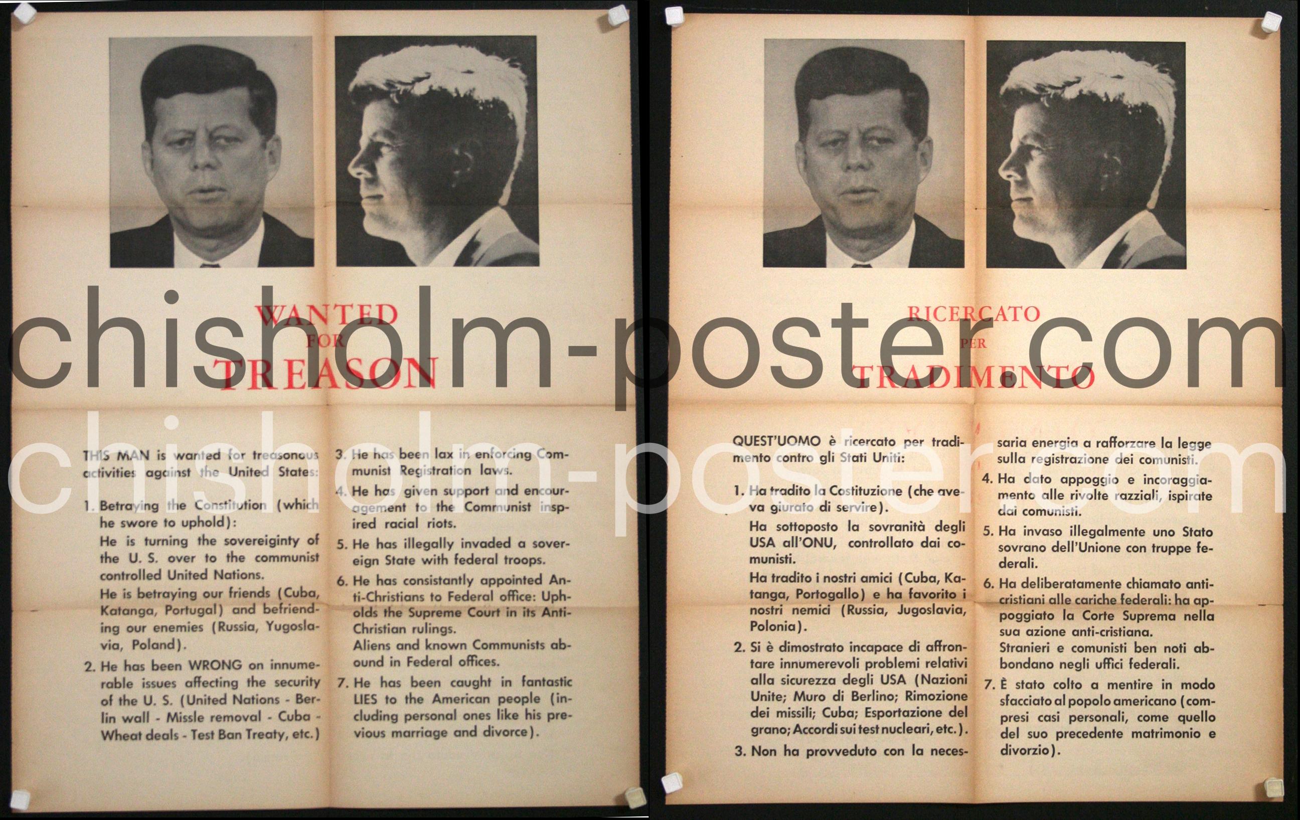 1962, poster criticizing JFK, double sided in English and Italian. Depiction of an Incendiary and scarce handbill, circulated in Dallas at the time of John F. Kennedy's November 1963 visit. Handbill proclaims, "WANTED FOR TREASON" below two front and profile photographs of Kennedy, and makes seven charges against him, including "Betraying the Constitution" and being lax in "enforcing Communist Registration laws." This was a supplement published in an Italian newspaper at the time.