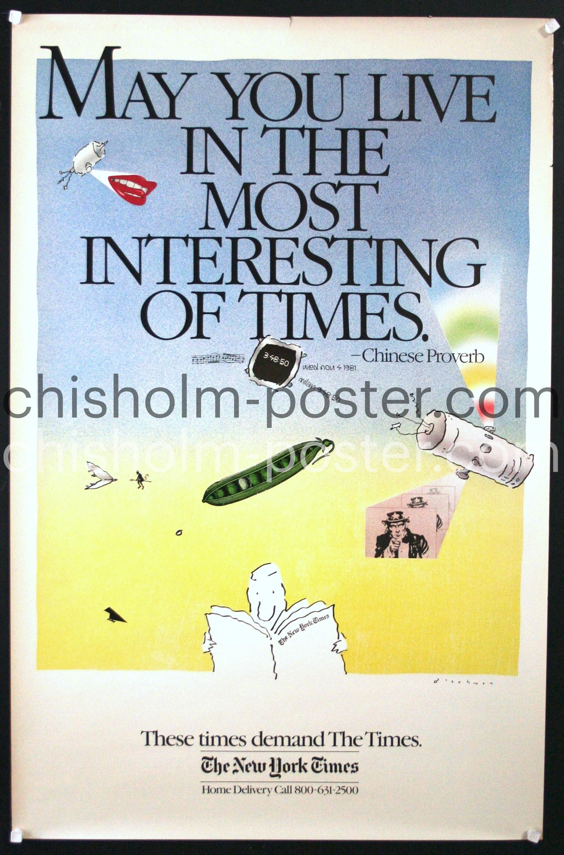 Poster for the New York Times. From "THESE TIMES DEMAND THE TIMES" series. Illustration by R.O. Blechman with the text: "May You Live in the Most Interesting of Times" misquoted as "A Chinese Proverb". Despite being so common in English as to be known as the "Chinese curse", the saying is apocryphal, and no actual Chinese source has ever been produced. (Wikipedia)