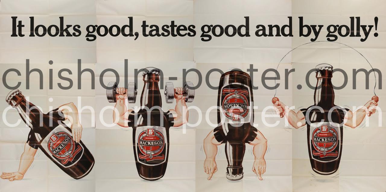 *ULTRA RARE* GIANT 12-SHEET 1960s BILLBOARD Advertising POSTER for Whitebread Mackeson's Beer. This is huge and super rare- Great graphics and color! Each separate sheet measures approx. 60 inches by 40 inches. That makes this is whopping 30 feet long by 10 feet tall if you put it all together. You can also break it up as each of the exorcising Mackeson beer men make up 2 sheet and the famous 1960's phrase runs 4 sheets across the top row. This is new old stock, found in the attic of an estate sale 6/12/14. There is hardly any advertising available for this brand. Please call or email to inquire about linen backing this piece.