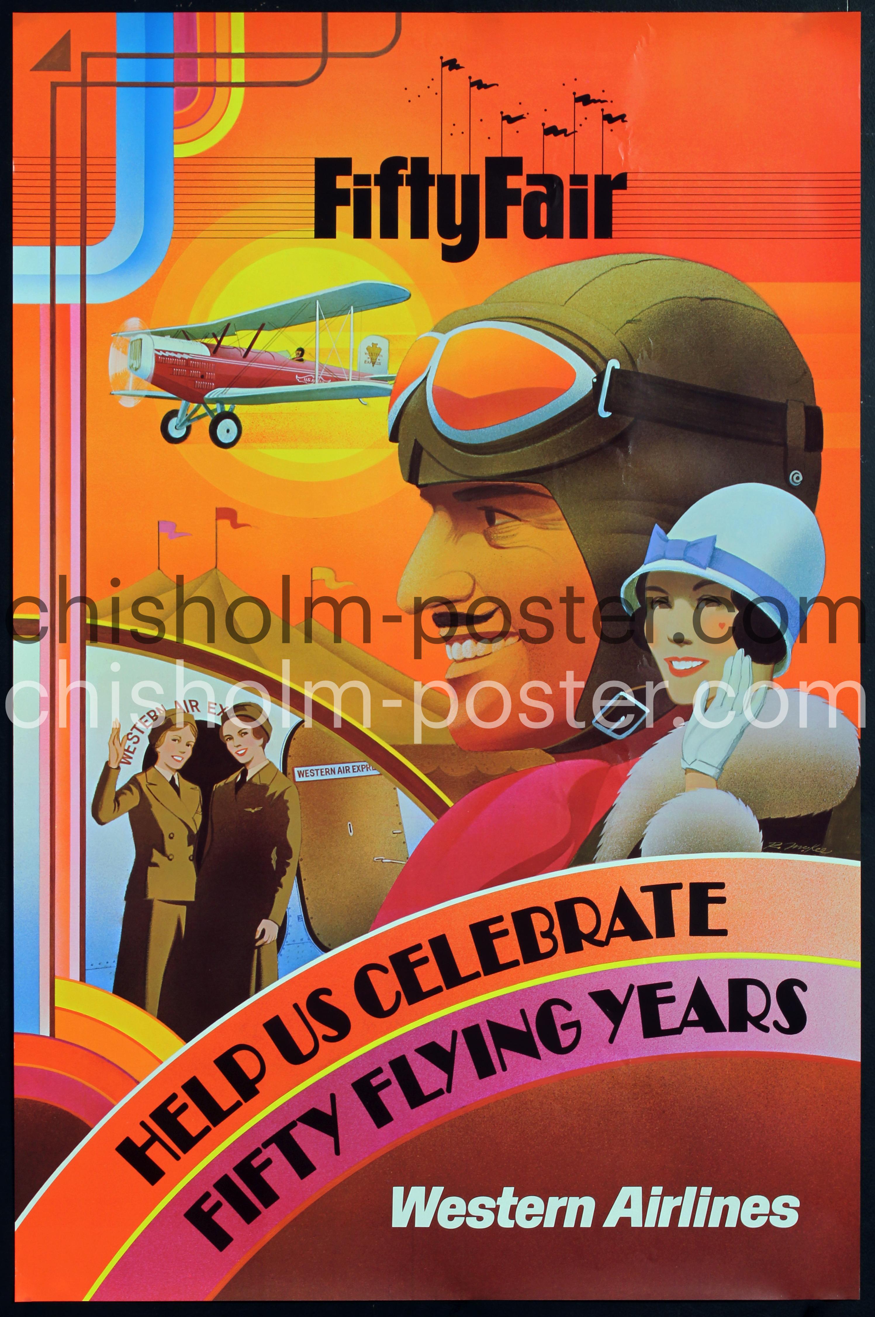 1975 Charming 50th anniversary poster for Western Airlines a now defunct California-based airline that operated from 1925 to 1987. NOTE: Some minor wear to the edges and minor creasing. Overall good to very good condition.