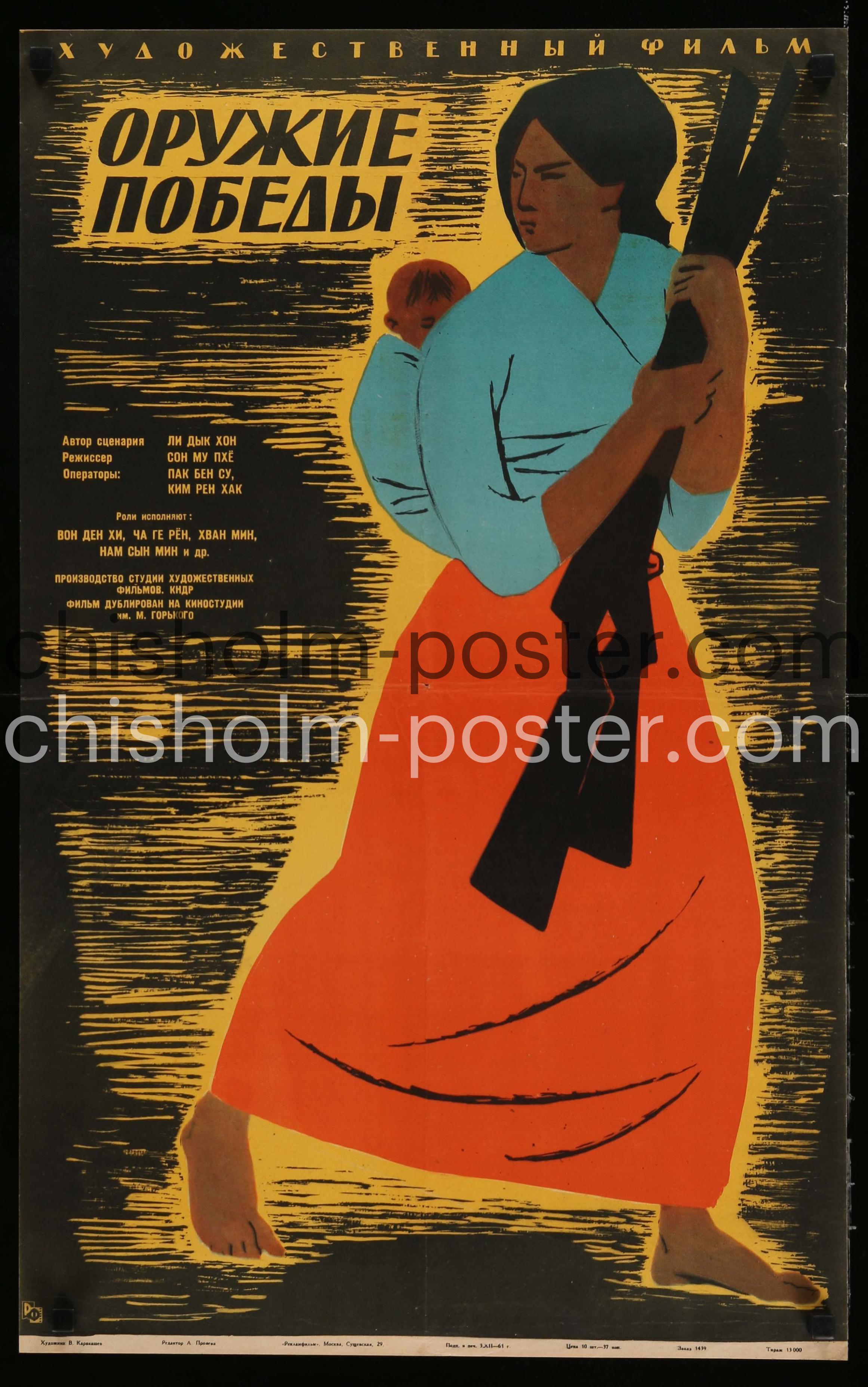Powerful 1961 North Korean war melodrama movie poster showing a mother with rifles carrying a baby on her back.