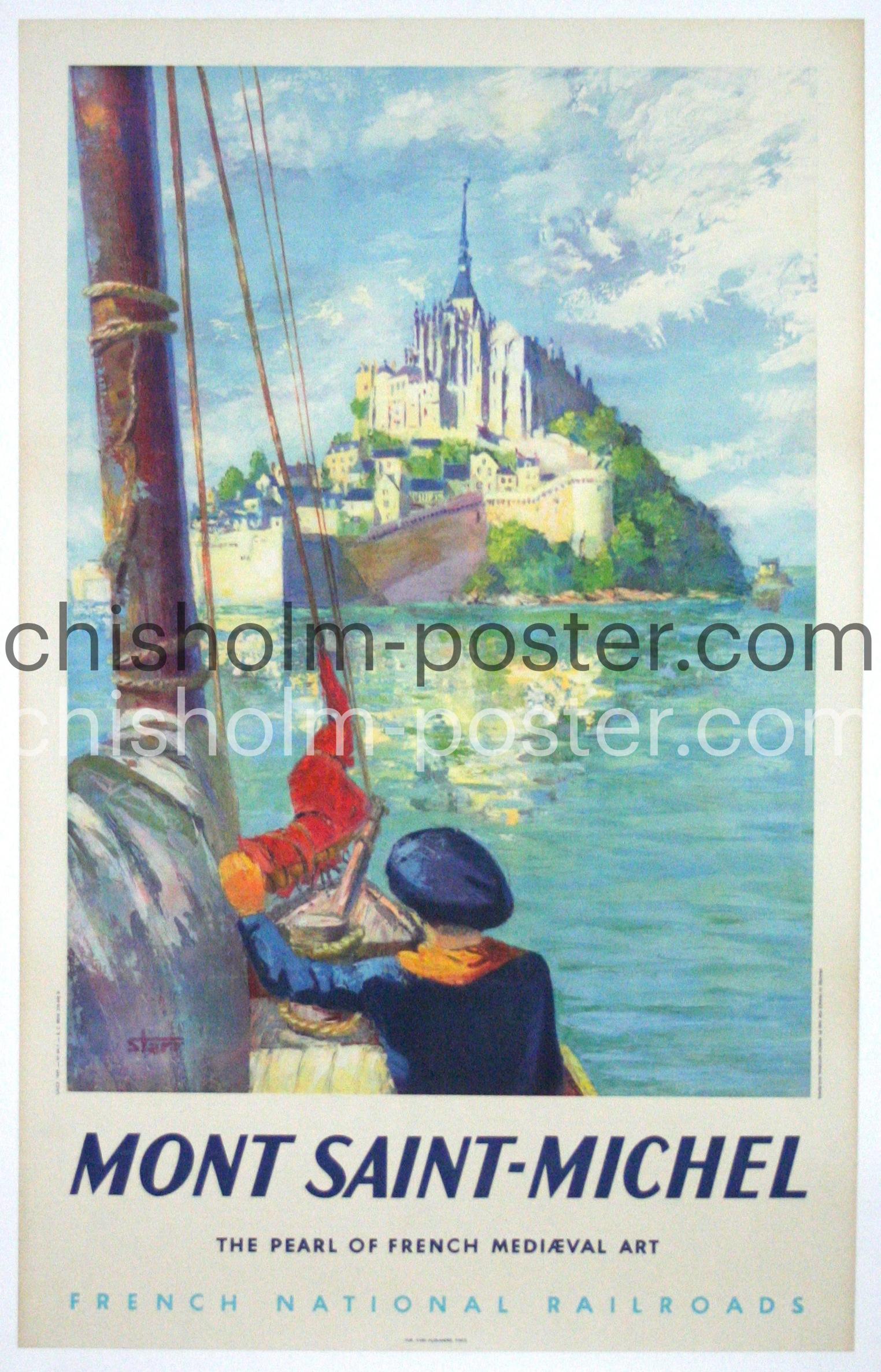 An impressionistic graphic for the French National Rails showing a sailor heading to the mysterious and lovely Mont Saint Michel island (officially inscribed as a World Heritage Site in 1979). NOTE: on archival linenbacking.