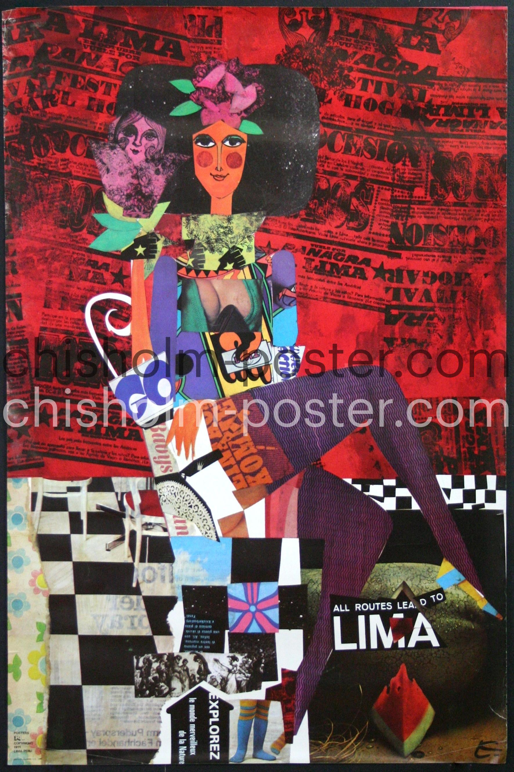 1971 poster with whimsical collage promoting travel to Lima, Peru!