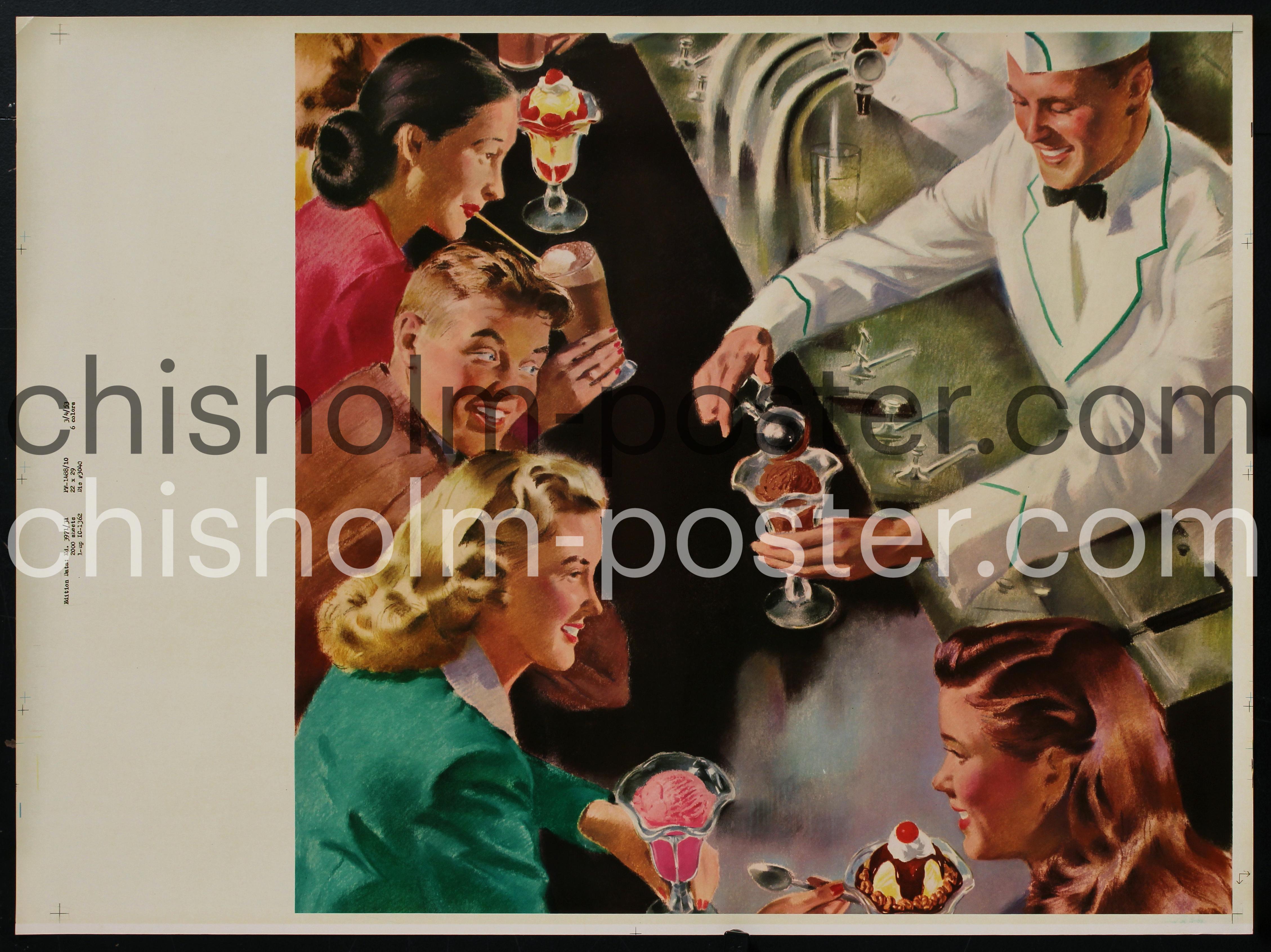 Fun 1953 uncut printer's sheet. This poster would've been mounted to board and cut-out to create a point-of-purchase display sign for soda shops, ice cream parlors, diners and lunch counters. Artwork by Pennsylvanian artist Albert W Hampson who created many commercial works and POP illustrations along with covers for the Saturday Evening Post and other publications. Artist is known because the original pastel artwork for this was offered at auction in 1996. An archive of his work is housed at the National Museum of American History at the Smithsonian.