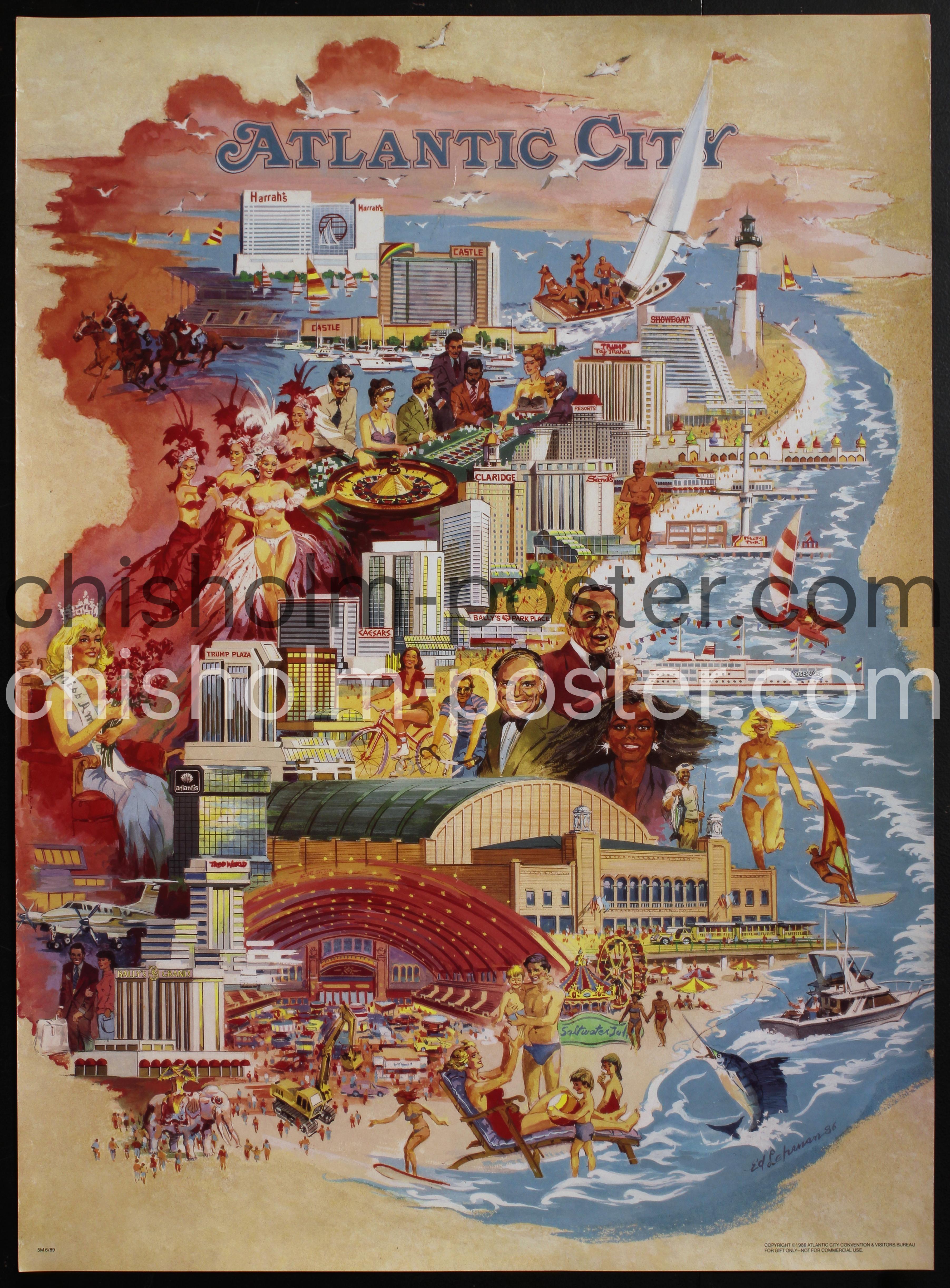 1980s poster with landmarks of Atlantic City including the boardwalk coastline, Caesar's, Harrahs, Trump Plaza, Miss American and Frank Sinatra.