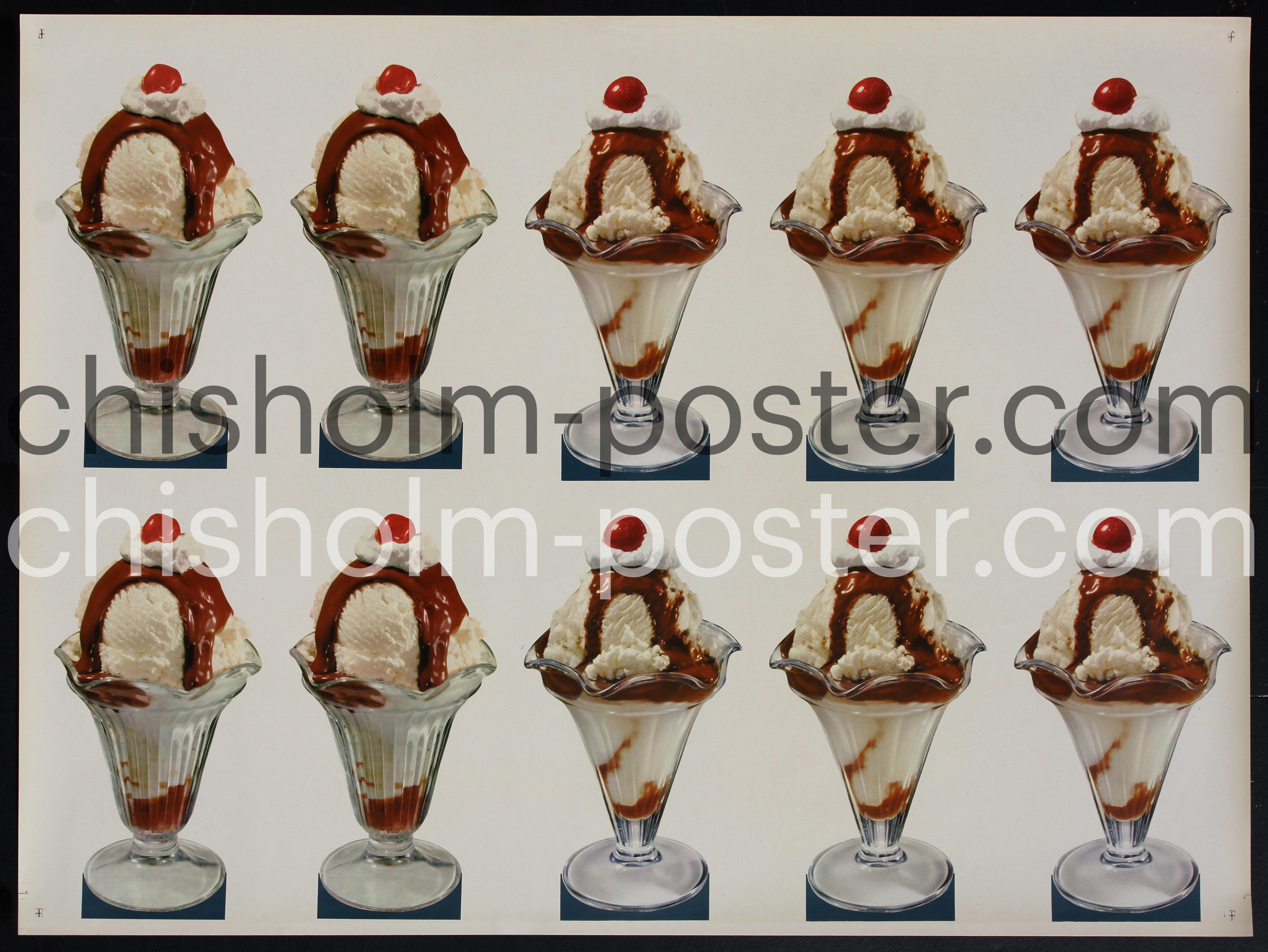 1950's American Die Cut poster showing ten chocolate fudge sundaes with cherries on top for point-of-purchase displays in soda shops/ ice cream parlors. Super sweet!