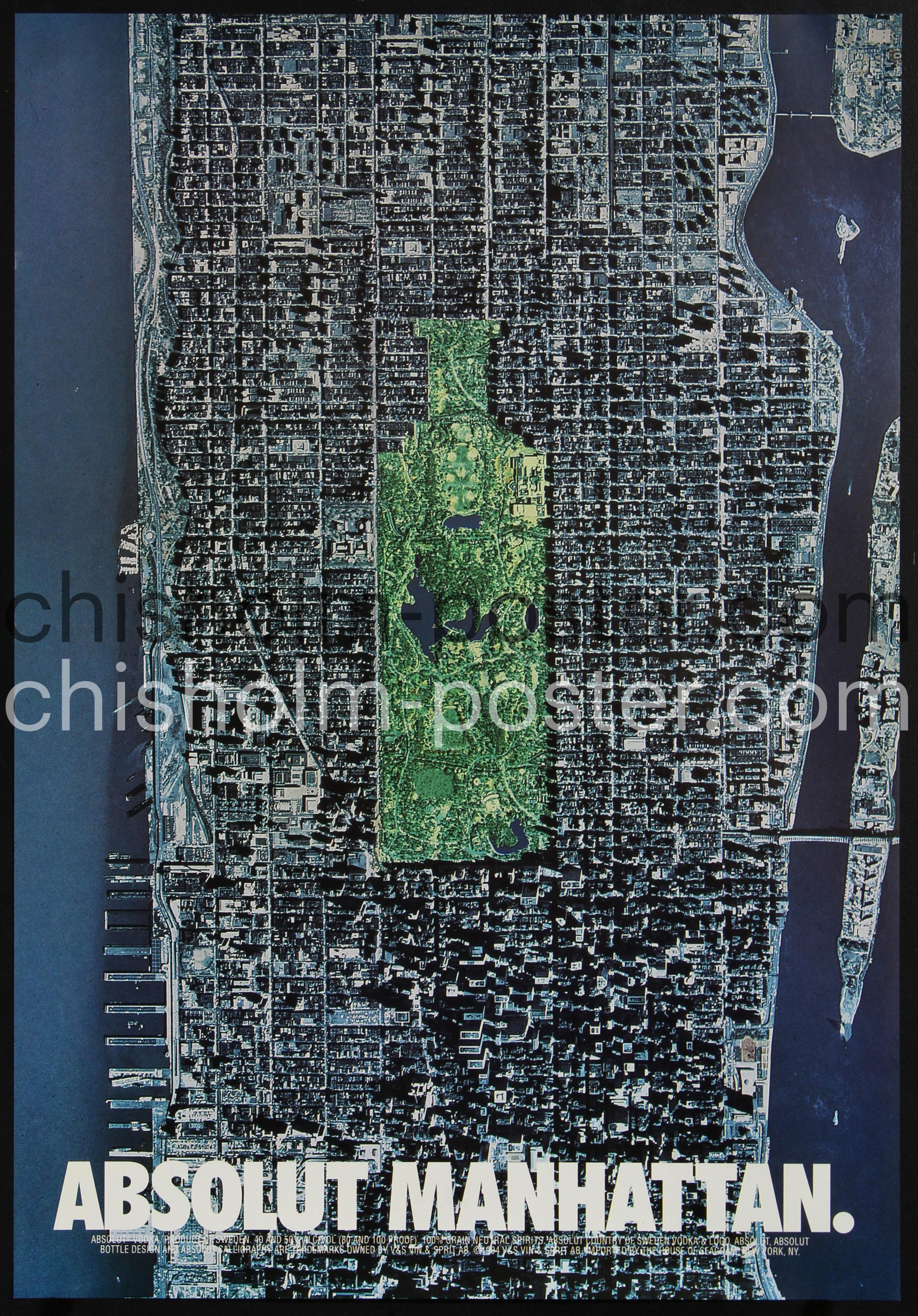 1994 Absolut Vodka poster with an aerial photograph of Manhattan but with Central Park in the shape of an Absolut bottle. Repurposed from an earlier 1980's design. Part of a series.
