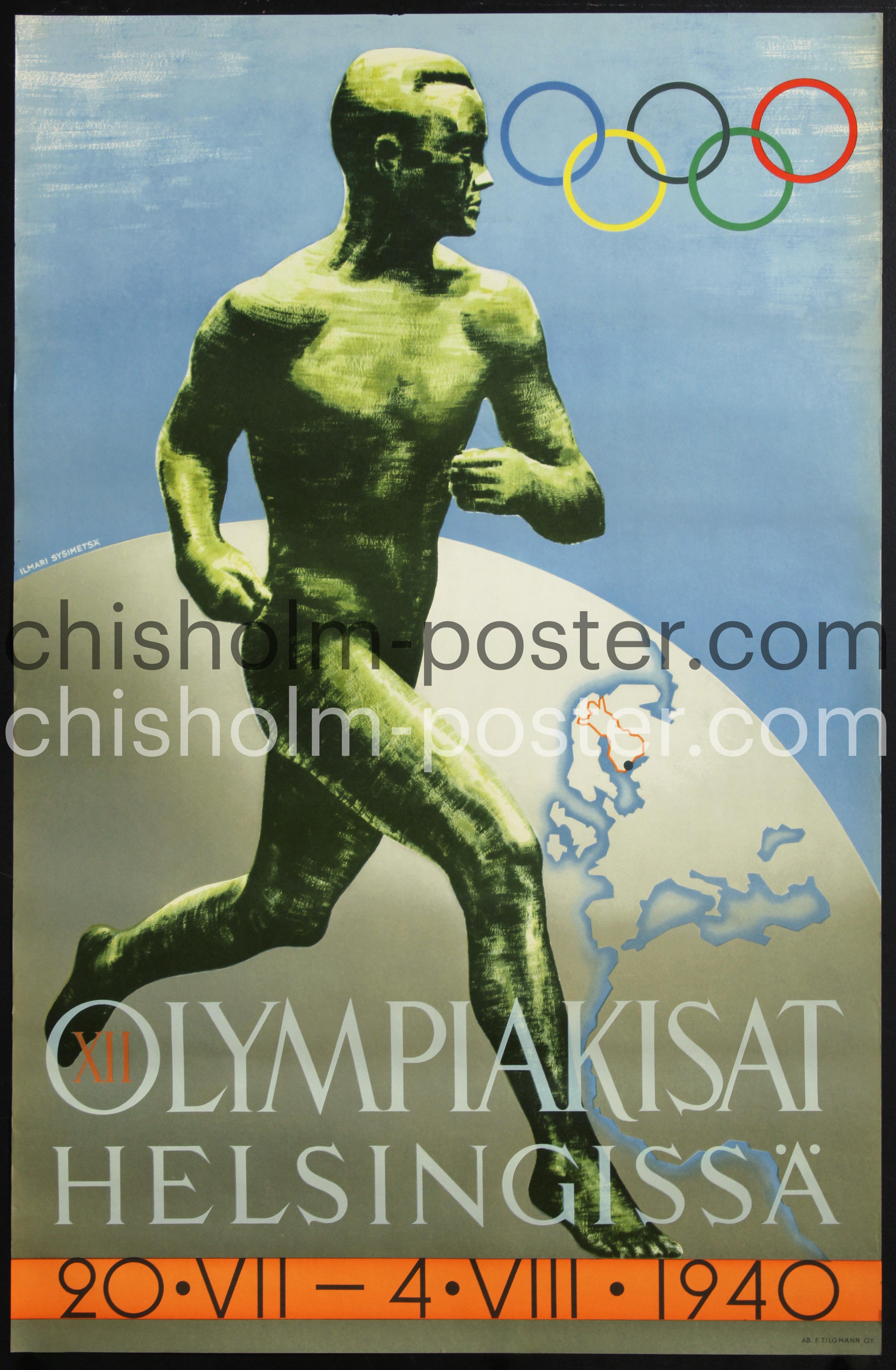 1940 Olympic poster with an abstract rendering of Paavo Nurmi, a Finnish middle-distance and long-distance runner, for the 1940 Helsinki Summer Olympics, officially known as the Games of the XII Olympiad, that were cancelled due to WWII. "Ilmari Sysimetsä is chiefly known for his famous Paavo Nurmi poster with which he won the poster competition in 1938 before the planned Olympic Games in 1940. His poster was eventually used for the Olympics in 1952. From an international point of view, this elegant poster came to be one of Finland’s most famous posters. In 1949, Ilmari Sysimetsä set up his own serigraphy printing house in Helsinki." -ComeToFindland.com. Bottom text reads: AB. F. Tilgmann OY
