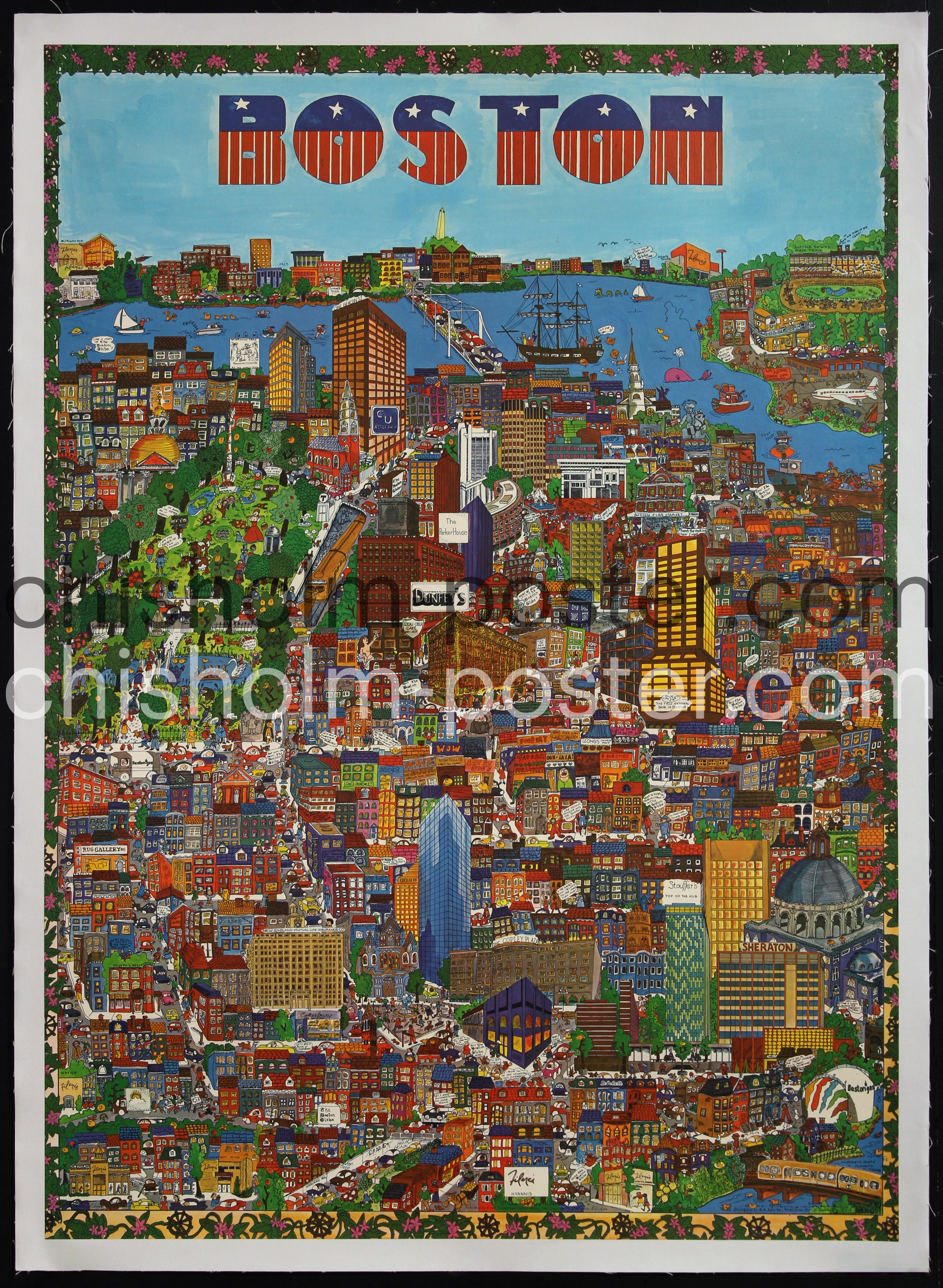 1972. NOTE: Mounted on archival linen-backing. The white border shown is the 1" linen-backing edge and is NOT part of the actual poster. Charming pictorial city map of Boston showing cultural landmarks. Wonderful details with The Boston Globe, Filene's (all over the city), Copley Plaza, Stouffer's, Cokesbury bookstore, New England Mutual Life Insurance, Dunfey's, Suffolk Down's Race Track, the Boston Flea Market, etc. Published by Trans Continental Cartographers from Vancouver, B.C. who illustrated several over-head maps of US and Canadian cities. Printed in Canada.