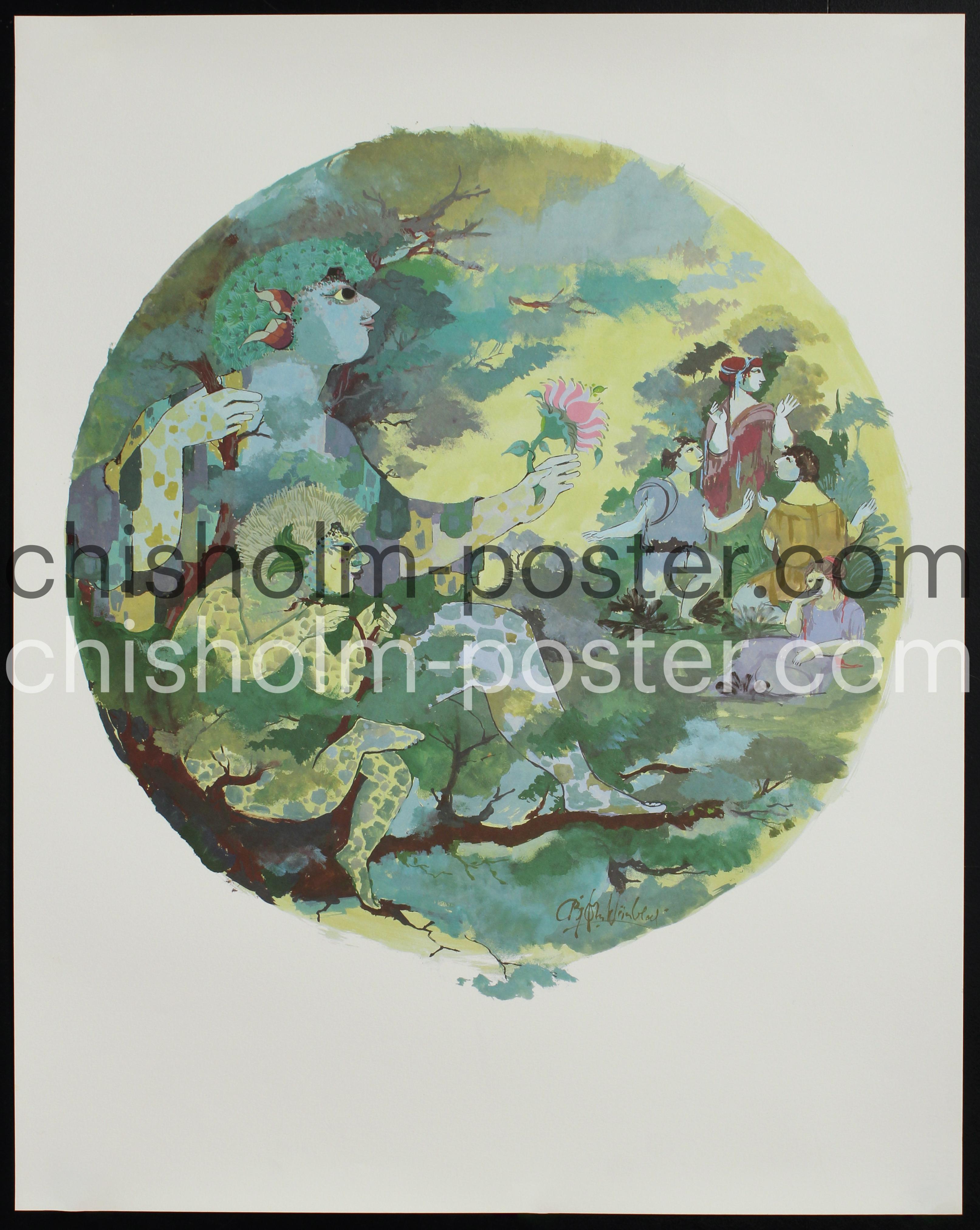 Charming 1960s pastoral print by famed Danish artist Bjorn Wiinblad. With Faunus/Fauni figures that are most likely an illustration of Oberon (the Fairy King) and Puck (aka Robin Goodfellow) from A Midsummer Night's Dream with the flower called "love-in-idleness" in hand, and in the distance the enchanted Athenian lovers Demetrius, Lysande fighting over Helena, with confused Hermia. NOTE: Printed on heavy weight artists watercolor paper.