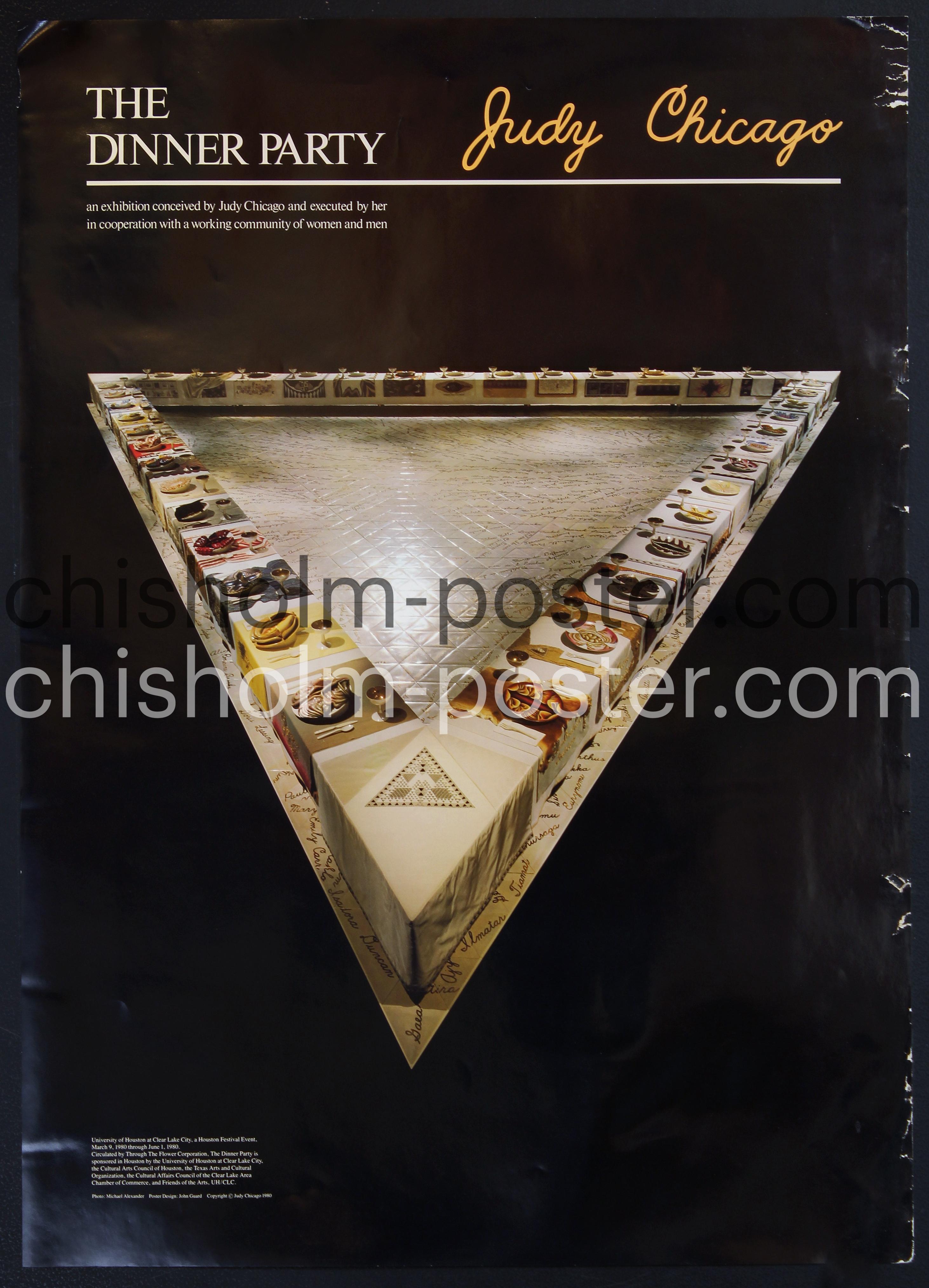 1980 Art Exhibition poster for an installation of Judy Chicago's famed piece "The Dinner Party" at the University of Houston at Clear Lake City. "The Dinner Party is an installation artwork by feminist artist Judy Chicago. Widely regarded as the first epic feminist artwork, it functions as a symbolic history of women in civilization. There are 39 elaborate place settings on a triangular table for 39 mythical and historical famous women... The Dinner Party was produced from 1974 to 1979 as a collaboration and first exhibited in 1979. Despite art world resistance, it toured to 16 venues in six countries on three continents to a viewing audience of 15 million. It was retired to storage from 1988 until 1996, as it was beginning to suffer from constant traveling.[1] Since 2007, it has been on permanent exhibition in the Elizabeth A. Sackler Center for Feminist Art at the Brooklyn Museum, New York." -Wikipedia. NOTE: Glossy surface, some water damage on right side with creases and tears in edge.